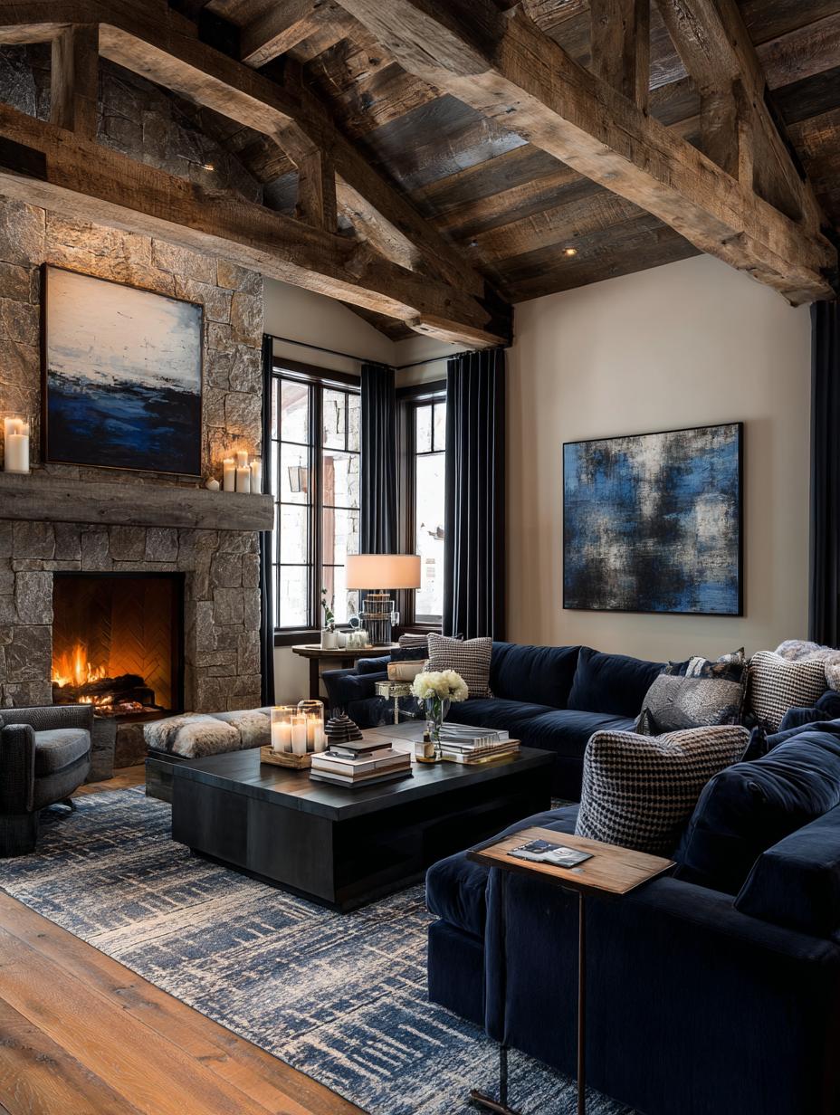 Weathered reclaimed wood beams create dramatic overhead architecture while a plush navy velvet sectional anchors this sophisticated living space. The stone fireplace adds rustic texture, balanced by sleek black window frames and abstract blue artwork. Layered lighting from table lamps and candles creates intimate ambiance, while the geometric area rug grounds the rich color palette of blues and warm neutrals.