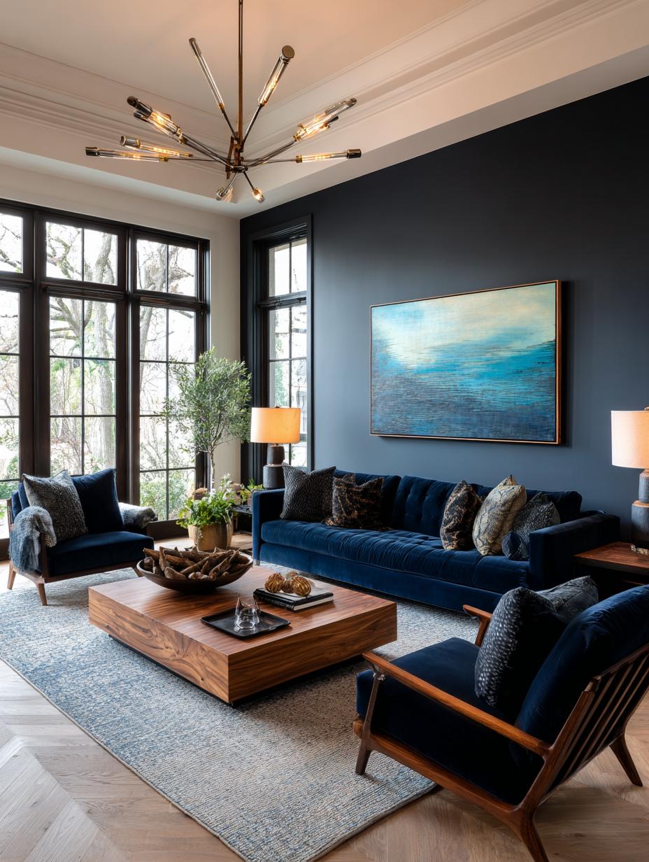 Rich navy walls create dramatic contrast against crisp white ceiling beams while a brass sputnik chandelier commands attention overhead. Deep blue velvet upholstery dominates the seating arrangement, complemented by a substantial walnut coffee table that anchors the space. Large black-framed windows flood the room with natural light, balancing the moody palette with bright outdoor views and creating an inviting yet refined atmosphere.