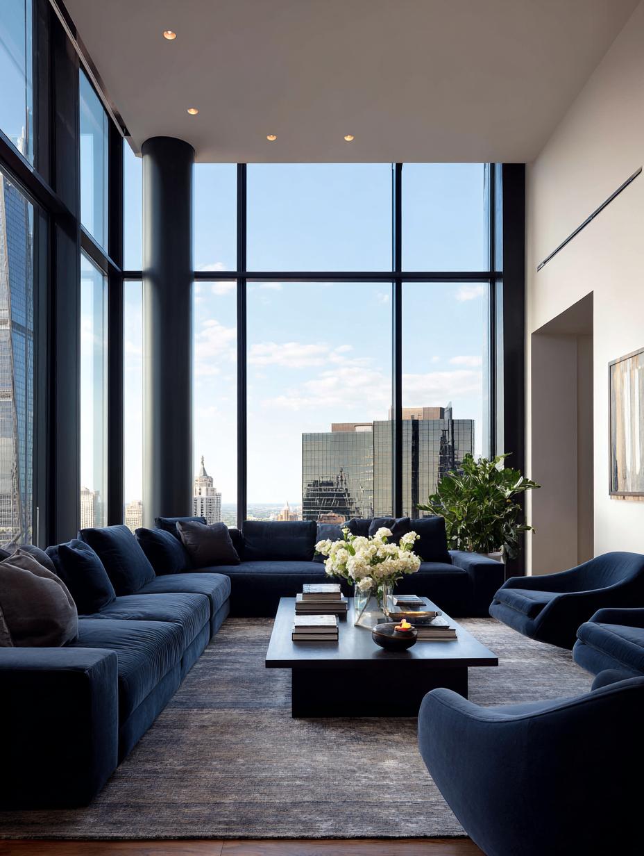 Floor-to-ceiling windows create a dramatic backdrop for this sumptuous navy velvet sectional arrangement. The deep blue upholstery commands attention while maintaining sophistication through clean lines and generous proportions. A sleek black coffee table anchors the seating area, topped with carefully curated books and fresh white hydrangeas. Recessed lighting adds warmth to the neutral palette, while the cityscape beyond enhances the luxurious metropolitan atmosphere.
