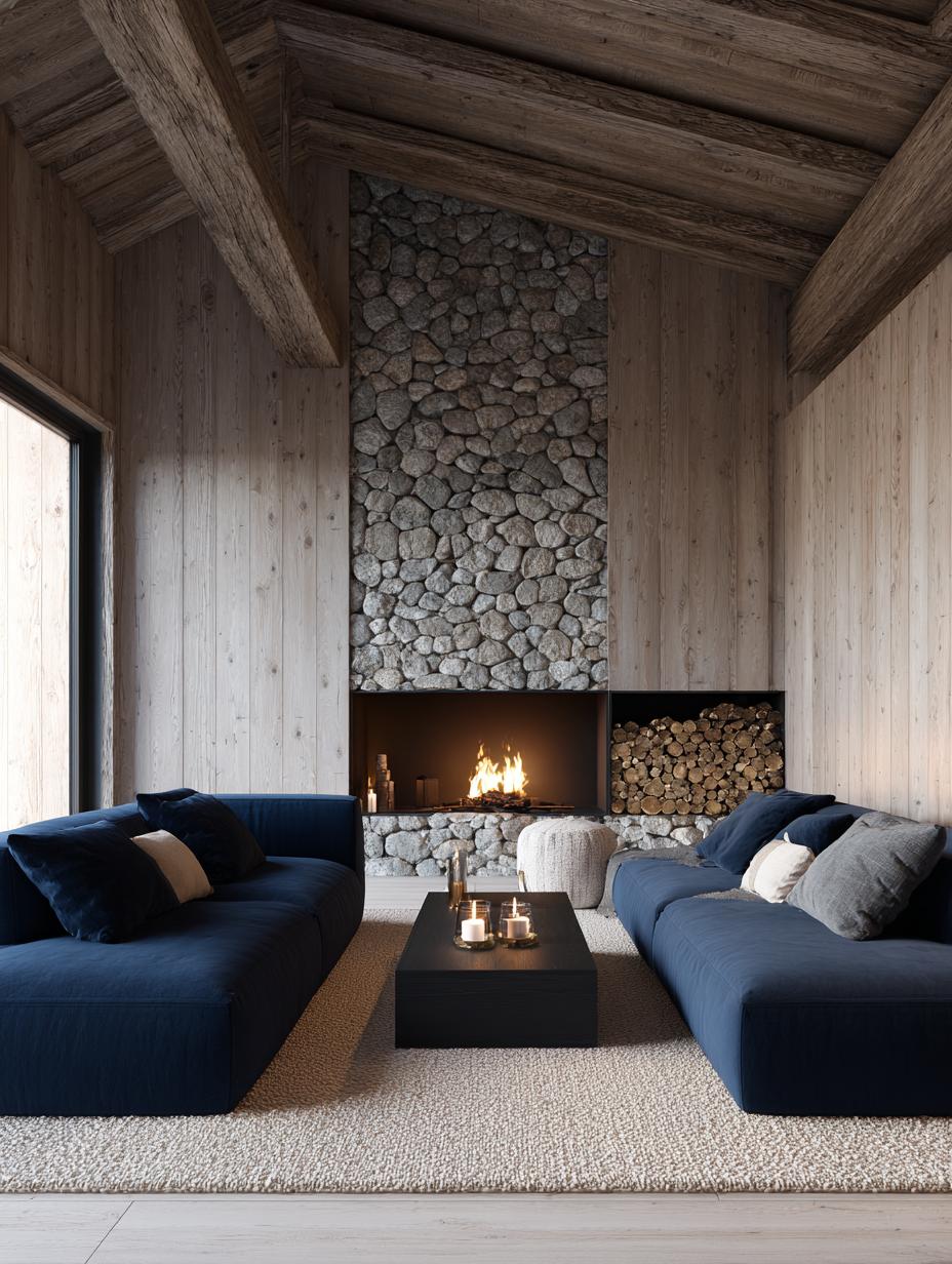 Natural river stone cascades from ceiling to floor, framing a sleek linear fireplace that anchors this sophisticated mountain living room. Deep navy sectionals create intimate conversation areas around a streamlined black coffee table, while exposed wood beams and vertical-grain cedar walls add organic warmth. Built-in firewood storage maximizes the stone feature wallโs impact while maintaining clean lines throughout the space.