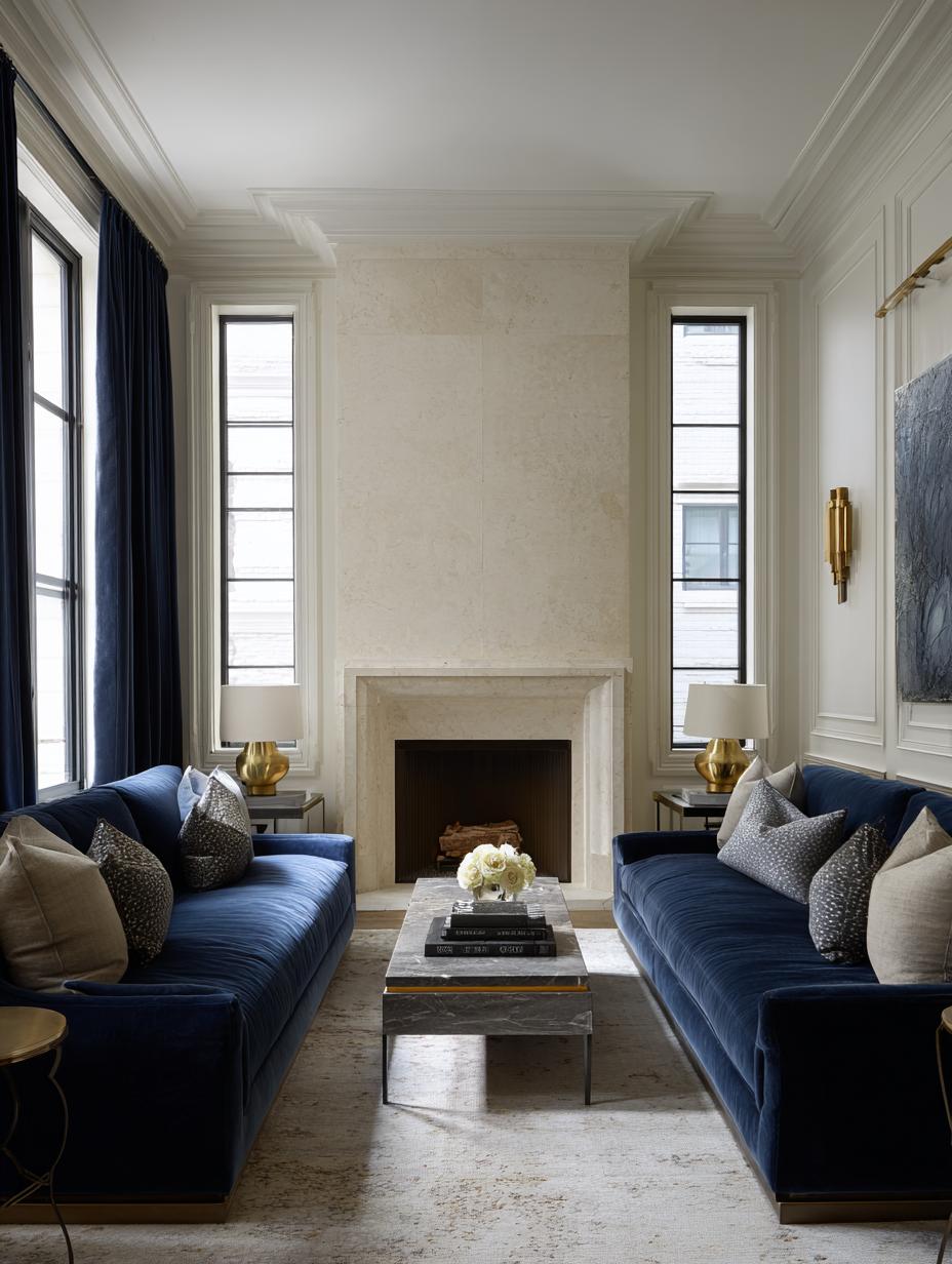 Plush navy velvet sofas anchor this refined living room with their rich texture and deep saturated color. Marble fireplace surround provides elegant contrast while leopard print pillows add subtle pattern without overwhelming the serene palette. Brass table lamps and matching sconces inject warm metallic accents that elevate the spaceโs luxurious feel. White crown molding and coffered ceiling details frame the room beautifully.