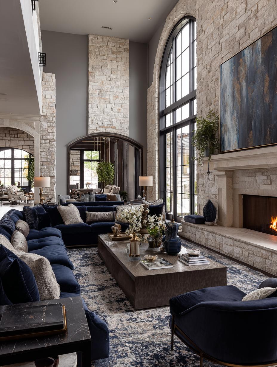 Natural stone walls create dramatic backdrop for plush navy velvet sectional seating in this high-ceiling living space. Dark wood coffee table anchors the conversation area while tall arched windows flood the room with natural light. Neutral throw pillows soften the bold navy upholstery, and a traditional area rug grounds the sophisticated color palette beneath classic architectural details.