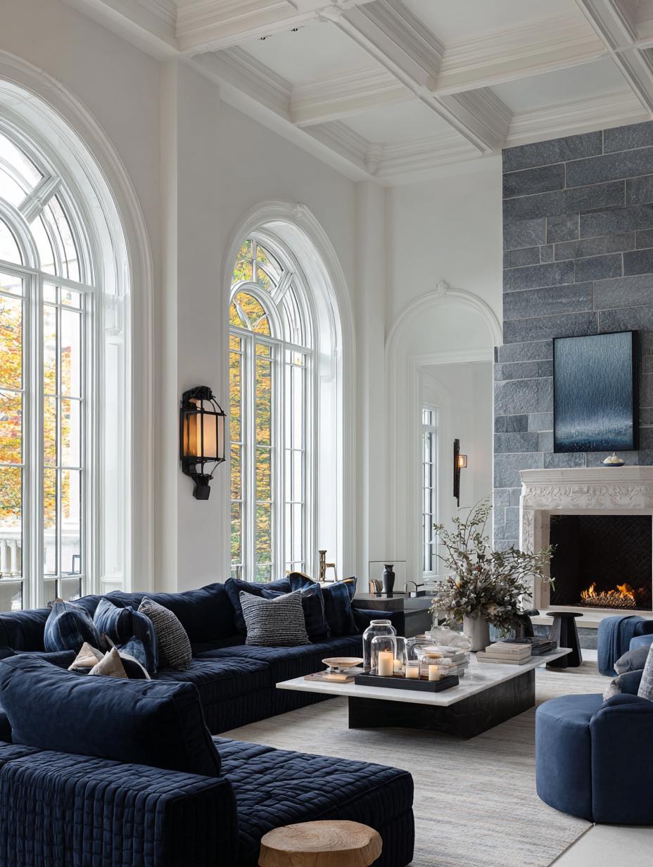Soaring arched windows flood this magnificent living room with natural light, perfectly complementing the rich navy velvet sectional that anchors the seating arrangement. Gray stone fireplace surround creates dramatic contrast against crisp white coffered ceilings, while the deep blue upholstery adds luxurious warmth. Brass wall sconces and carefully curated accessories on the dark wood coffee table complete this sophisticated palette that whispers understated elegance.