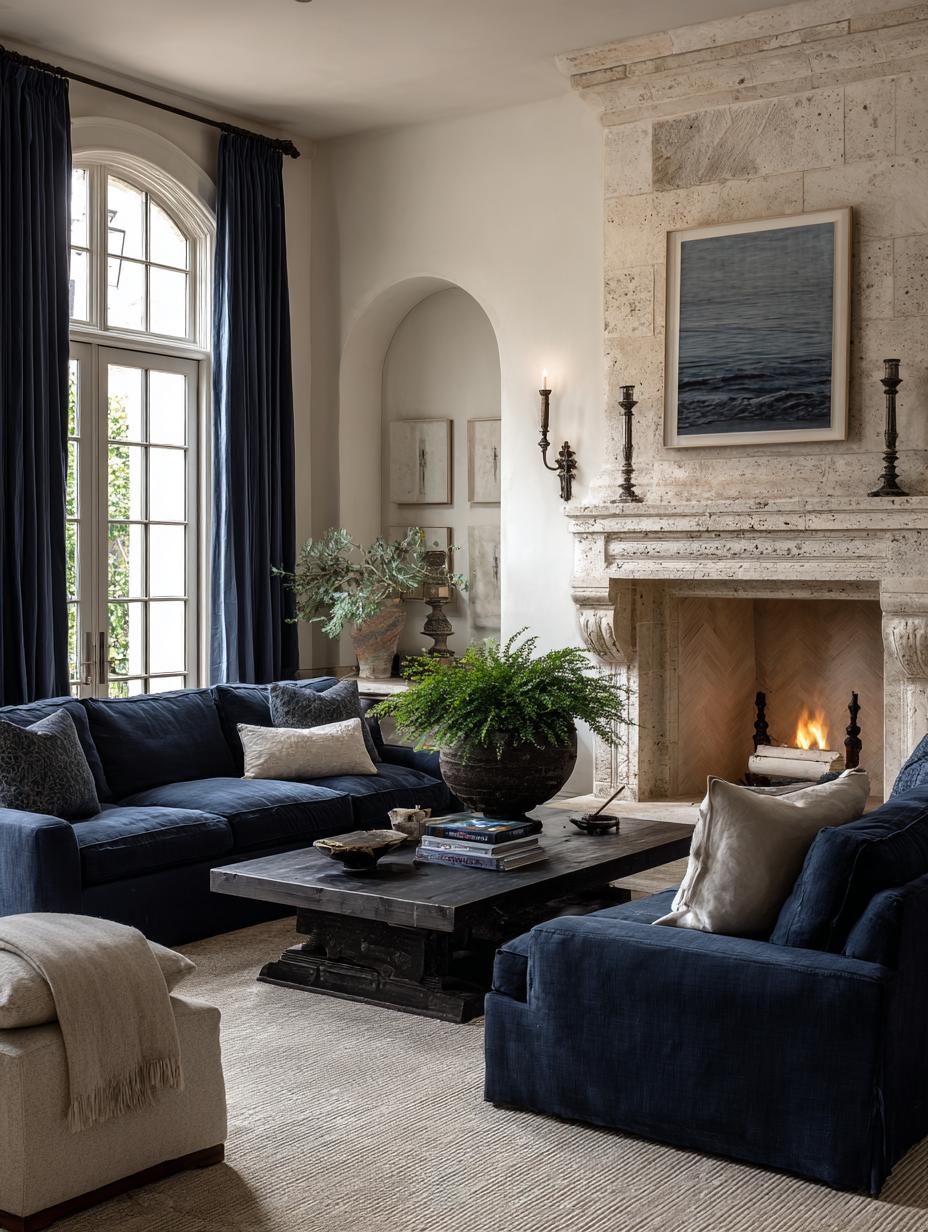 Rich navy velvet upholstery creates luxurious contrast against the textured travertine fireplace surround in this sophisticated living room. Natural light streams through arched French doors while dark curtains frame the windows dramatically. Antique brass candlesticks and a large fern soften the stoneโs rustic texture, while the chunky knit throw adds tactile warmth to the refined seating arrangement.
