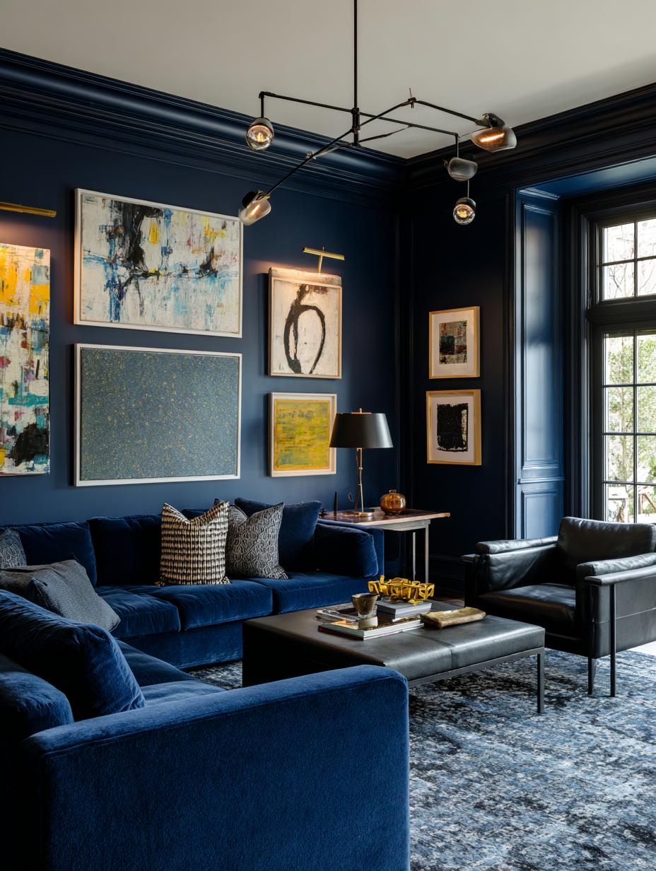 Rich navy walls create an intimate gallery atmosphere where contemporary art takes center stage above plush velvet seating. Crown molding and brass picture lights elevate the collected artwork, while a modern mobile chandelier adds sculptural drama overhead. Mixed textures through patterned throw pillows and a vintage-inspired area rug soften the sophisticated color palette, creating an inviting space that balances artistic curation with comfortable living.