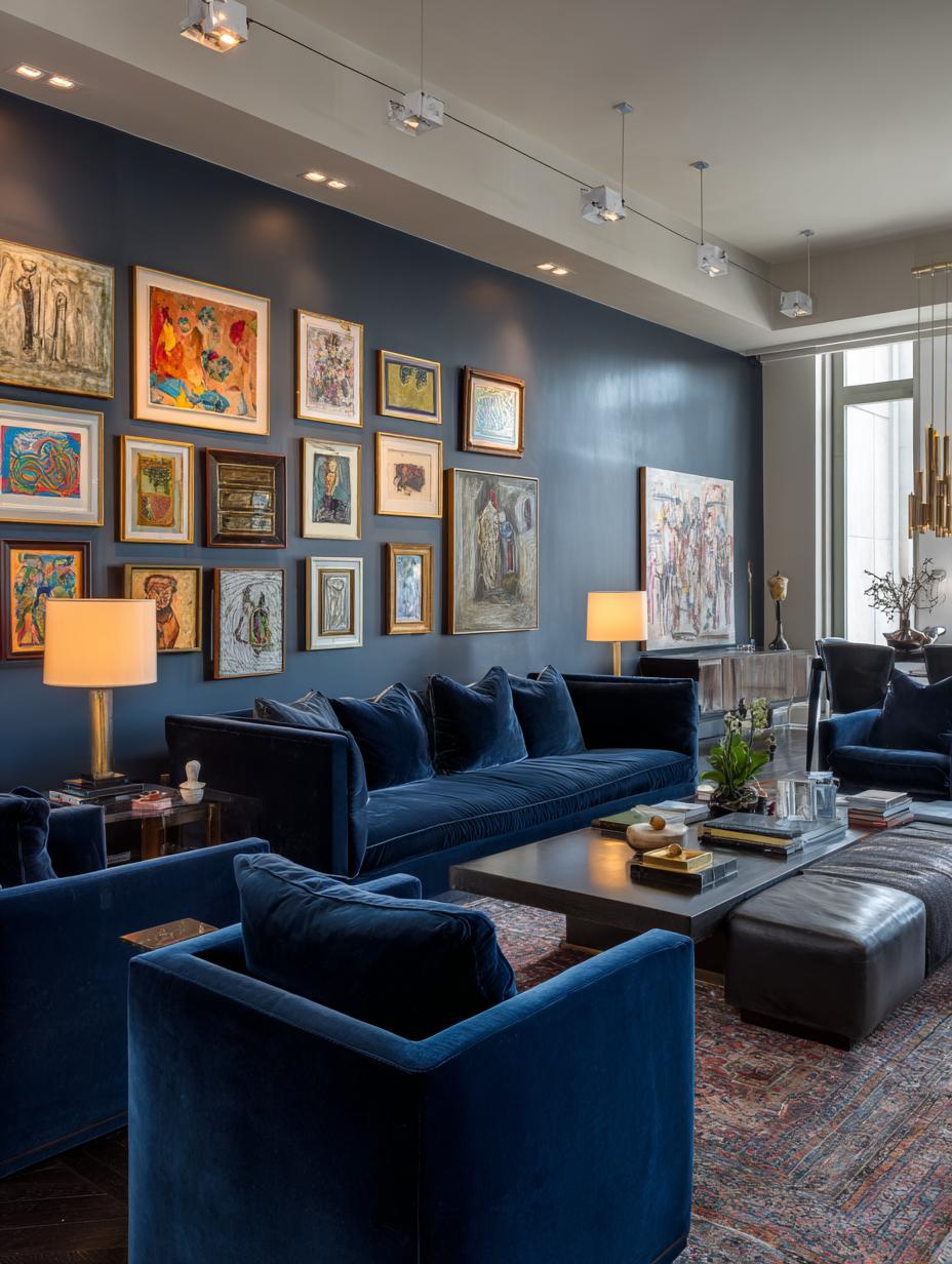 Rich navy velvet upholstery transforms this sophisticated living room into a collectorโs sanctuary. Multiple framed artworks create an impressive gallery wall against the moody blue accent wall, while brass track lighting illuminates each piece with museum-quality precision. The deep color palette extends seamlessly from furniture to wall, establishing visual continuity that feels both luxurious and intentional throughout the space.
