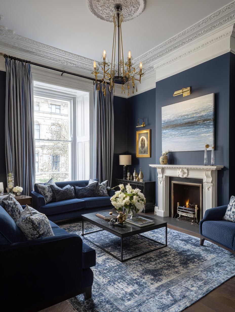 Ornate ceiling moldings and a brass chandelier create dramatic contrast against deep navy walls in this sophisticated Georgian-style living room. Rich velvet upholstery anchors the seating arrangement around a sleek black coffee table, while the white marble fireplace serves as an elegant focal point. Striped curtains and vintage brass accents complete the luxurious palette that balances historical architecture with modern comfort.