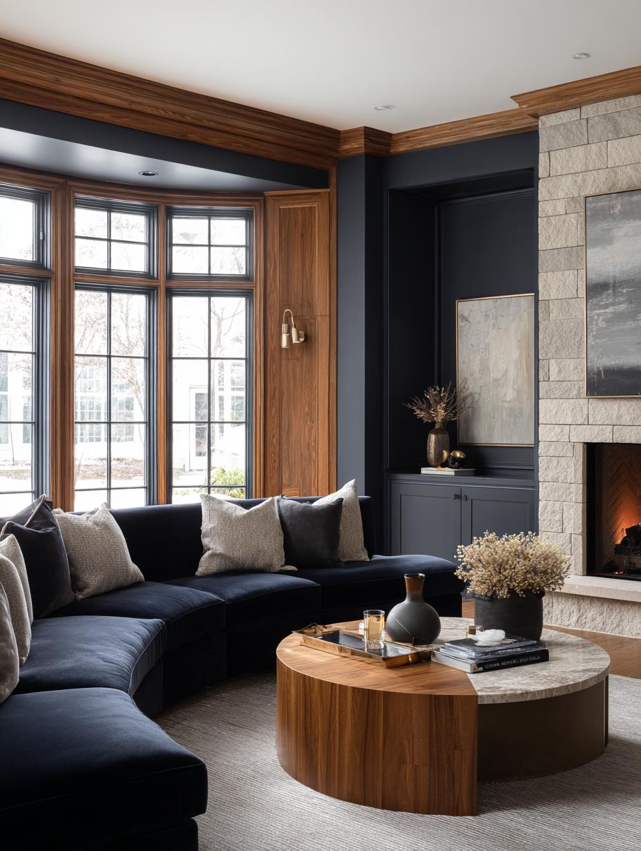 Rich navy velvet upholstery creates luxurious comfort while warm walnut wood trim and coffered ceiling details add architectural sophistication. Stone fireplace walls provide textural contrast against the deep blue palette, establishing a refined foundation for entertaining. Mixed metallic accents and neutral throw pillows soften the dramatic color scheme, creating an inviting yet polished atmosphere perfect for discerning homeowners.