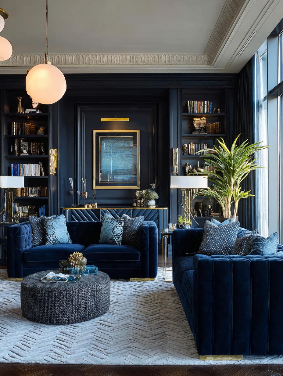 Rich navy blue millwork envelops every surface, from coffered ceiling to built-in bookcases, establishing an unmistakably luxurious foundation. Brass accents gleam throughoutโfrom the ornate ceiling medallion to picture lighting and side table details. Deep velvet upholstery in coordinating navy tones pairs with patterned throw pillows, while a sleek black coffee table anchors the seating arrangement. Layered lighting and carefully curated accessories complete this sophisticated gentlemanโs library aesthetic.