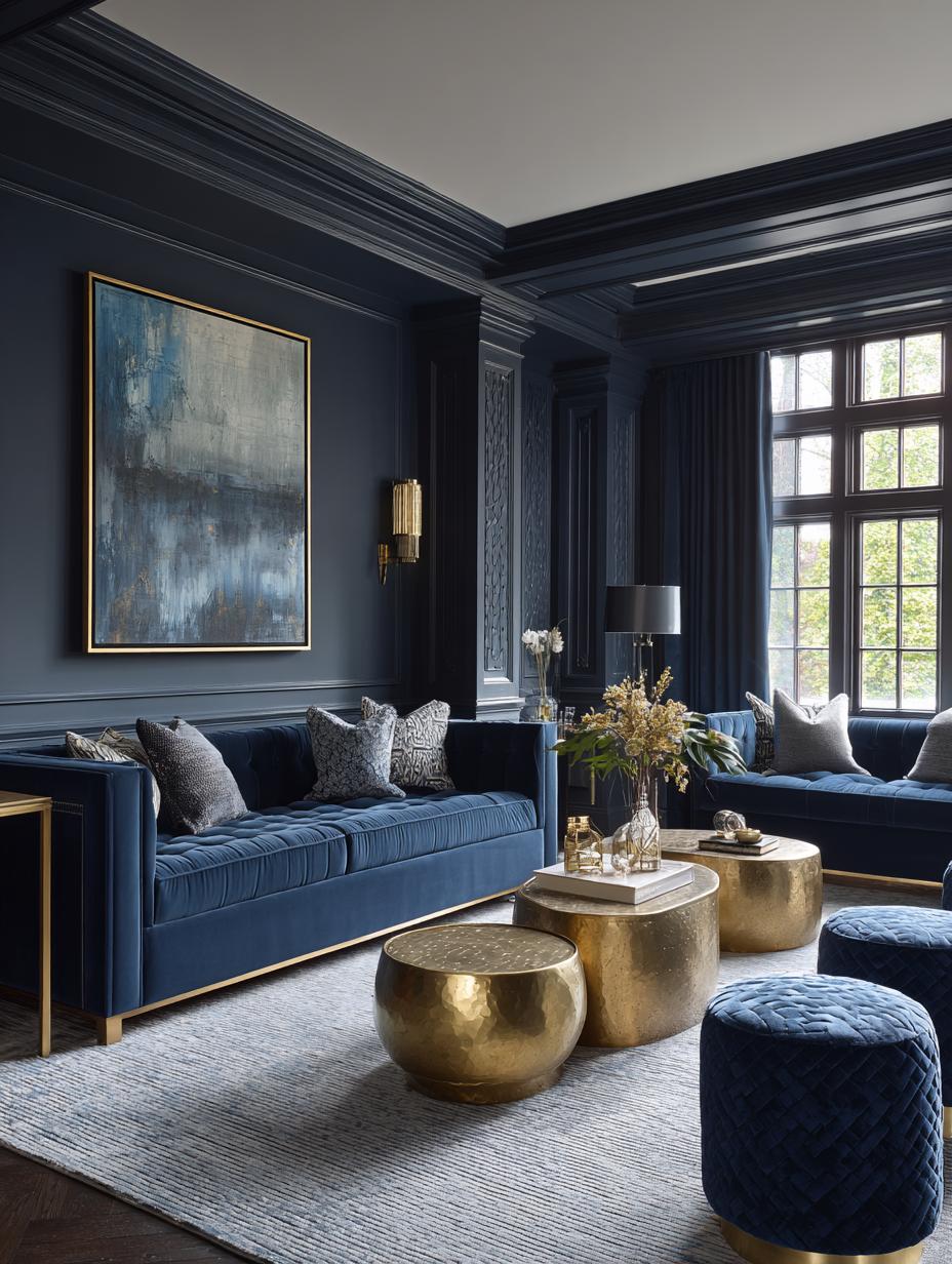 Rich navy blue millwork envelops this sophisticated living space, creating dramatic depth through layered moldings and custom built-ins. Channeled velvet sofas in matching navy blue anchor the seating arrangement, while hammered brass coffee tables add warmth and texture. Natural light filters through elegant windows, balancing the moody palette with bright contrast. Quilted round ottomans and curated artwork complete this expertly layered design that exudes quiet confidence.
