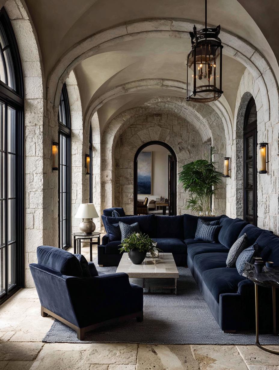 Stone barrel vaults and towering arched windows transform this navy velvet sectional into a Mediterranean masterpiece. Rich travertine floors ground the deep blue upholstery while wrought iron lanterns cast warm pools of light across the space. Multiple seating zones flow seamlessly from the main conversation area toward the arched doorway, creating an elegant progression through this luxury loggia that balances Old World architecture with contemporary comfort.