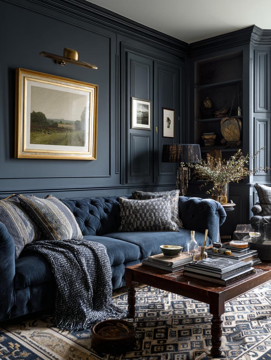 Deep navy paneling creates dramatic architectural interest while brass picture lights illuminate carefully curated artwork. Luxurious tufted velvet upholstery pairs with geometric throw pillows and woven blankets to soften the formal millwork. Built-in shelving displays collected treasures, while the patterned area rug grounds rich wood furnishings and creates visual warmth against the bold wall color.