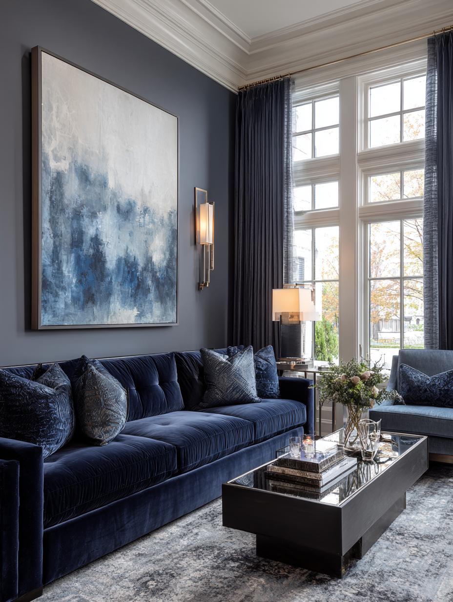 Luxurious navy velvet upholstery transforms this living room into a gallery-worthy sanctuary where rich textures meet refined artistry. Deep charcoal walls provide the perfect backdrop for an abstract blue-toned painting, while brass sconces add warm ambient lighting. The tufted sofaโs sumptuous fabric coordinates beautifully with matching navy curtains, creating layers of sophisticated depth. A sleek glass-top coffee table grounds the space with modern minimalism.