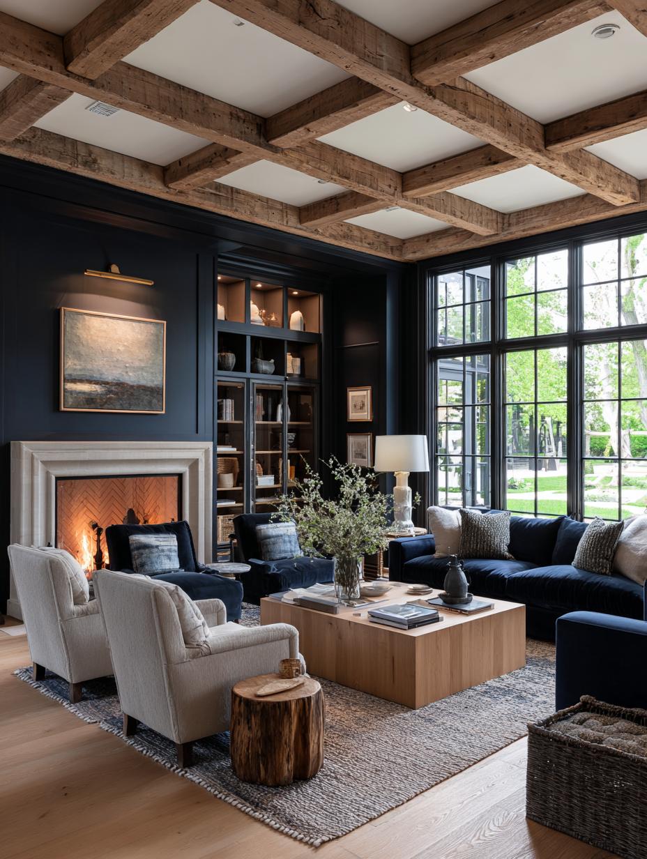 Exposed reclaimed wood beams create stunning architectural interest above this navy-walled sanctuary, where a plush sectional anchors the seating arrangement. Natural light floods through black-framed windows, highlighting the walnut coffee table and built-in shelving that displays curated collections. Neutral linen chairs balance the rich blue palette while a herringbone brick fireplace adds warmth and classic charm to this expertly layered space.