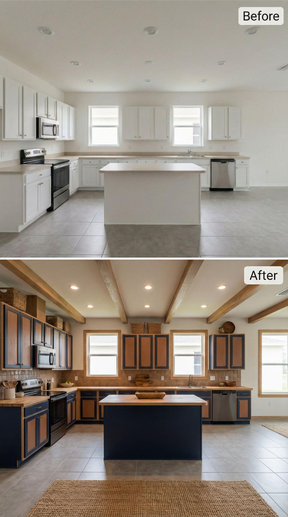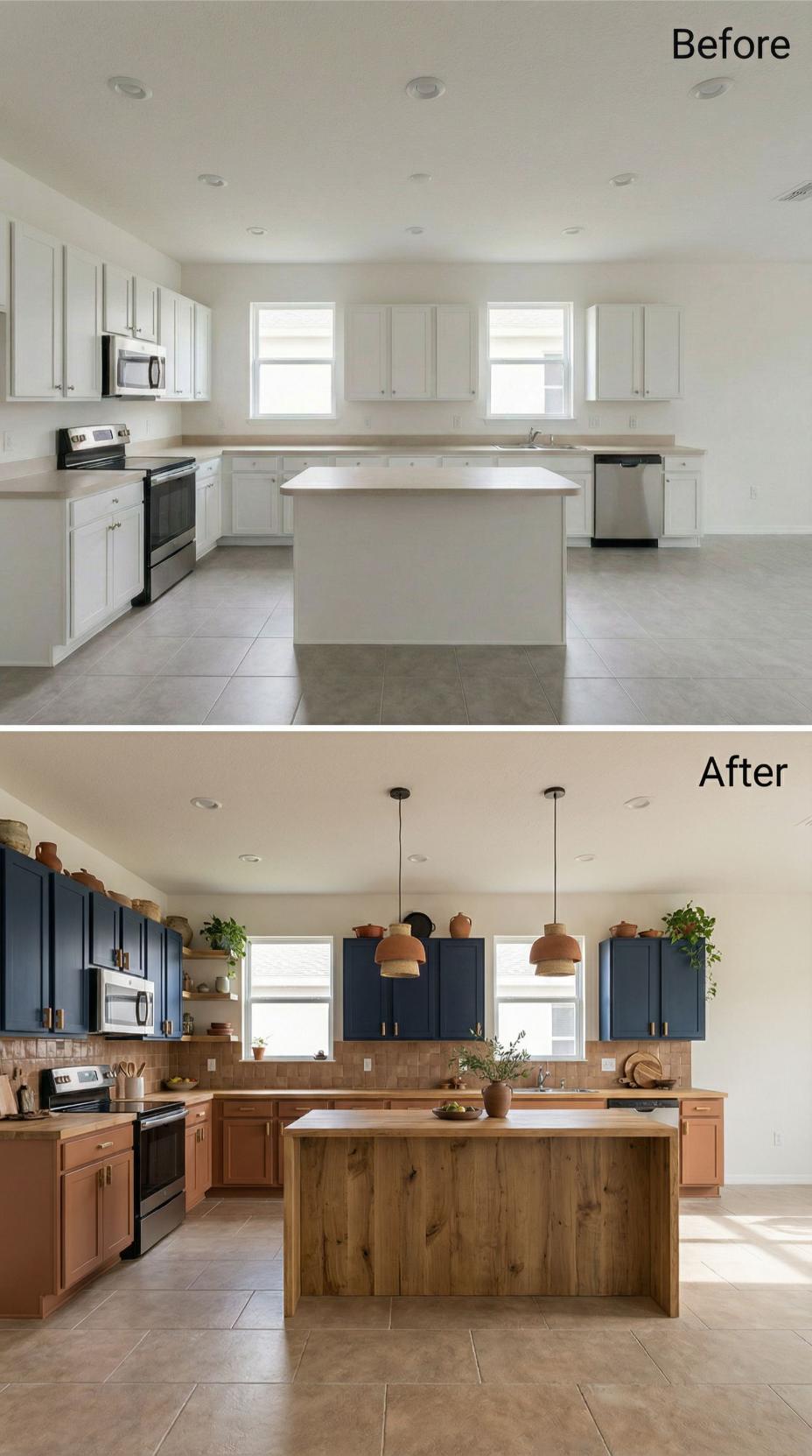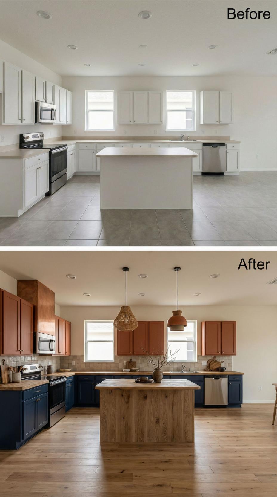 Builder-grade white cabinets transformed into a stunning two-tone masterpiece featuring rich navy blue lower cabinets paired with warm copper uppers. Natural wood butcher block countertops replace basic laminate, while the original white island gains rustic wood paneling. Woven rattan pendant lights and warm wood flooring complete this serene yet vibrant transformation that perfectly balances minimalist Japanese aesthetics with bohemian warmth.