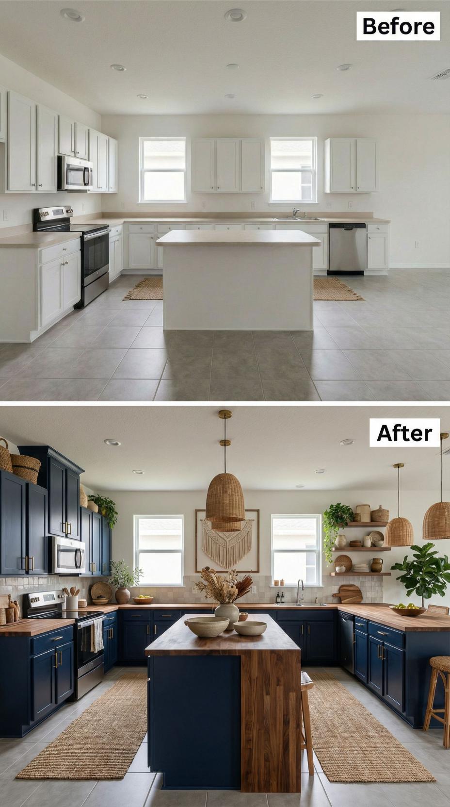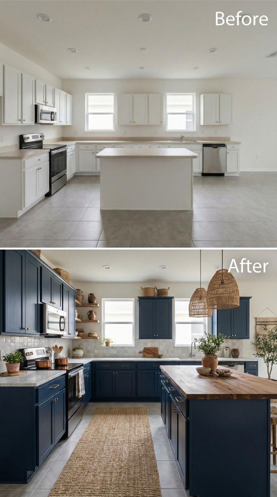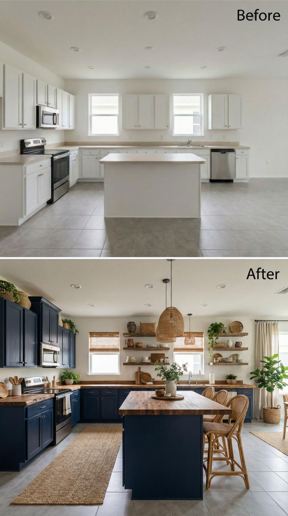 Deep navy blue painted cabinets completely reimagine this builder-grade kitchen, replacing stark white surfaces with rich color and personality. Warm wood countertops crown the island while woven pendant lights and open floating shelves introduce organic textures. Natural jute rugs, trailing greenery, and earthy ceramic bowls create a relaxed bohemian atmosphere that celebrates both function and style.