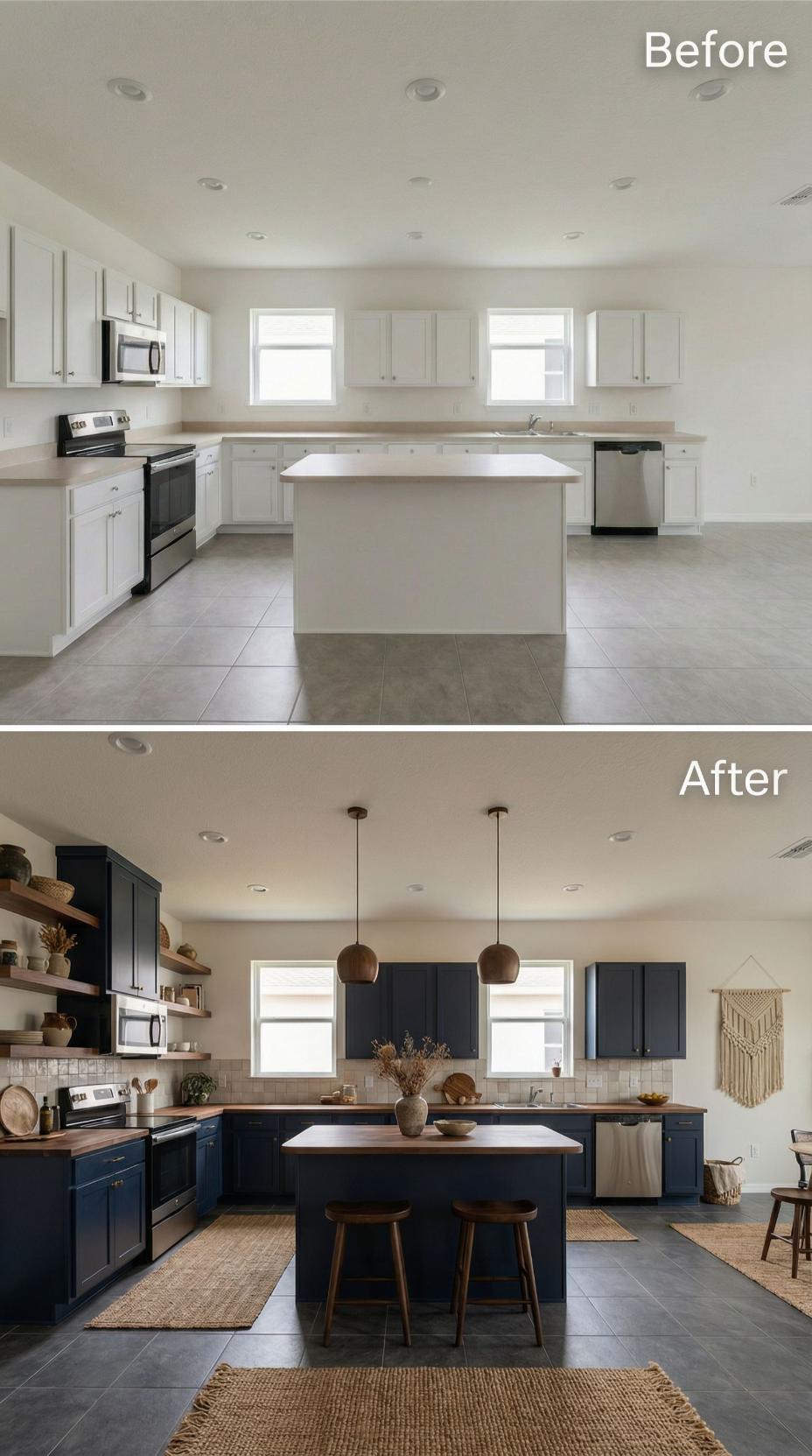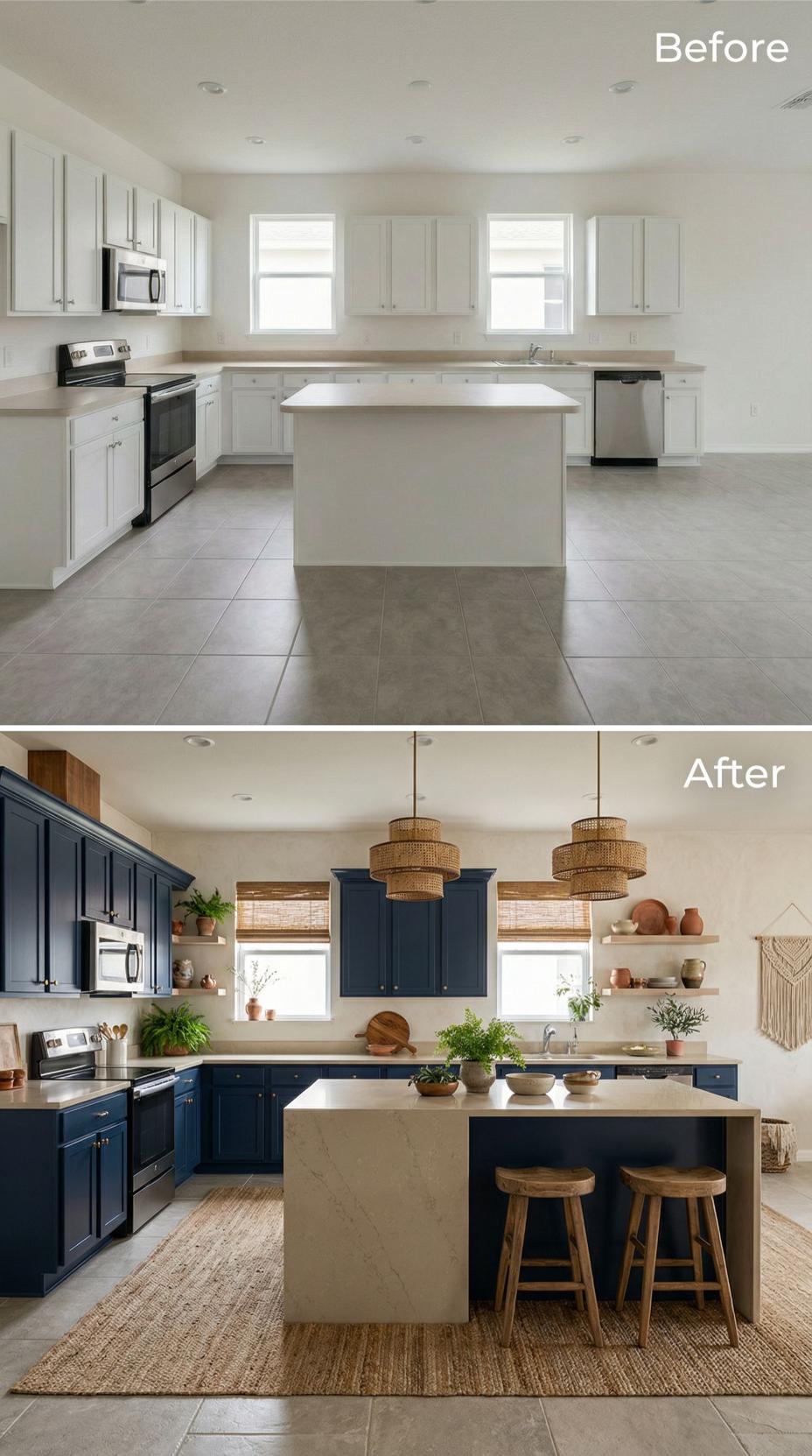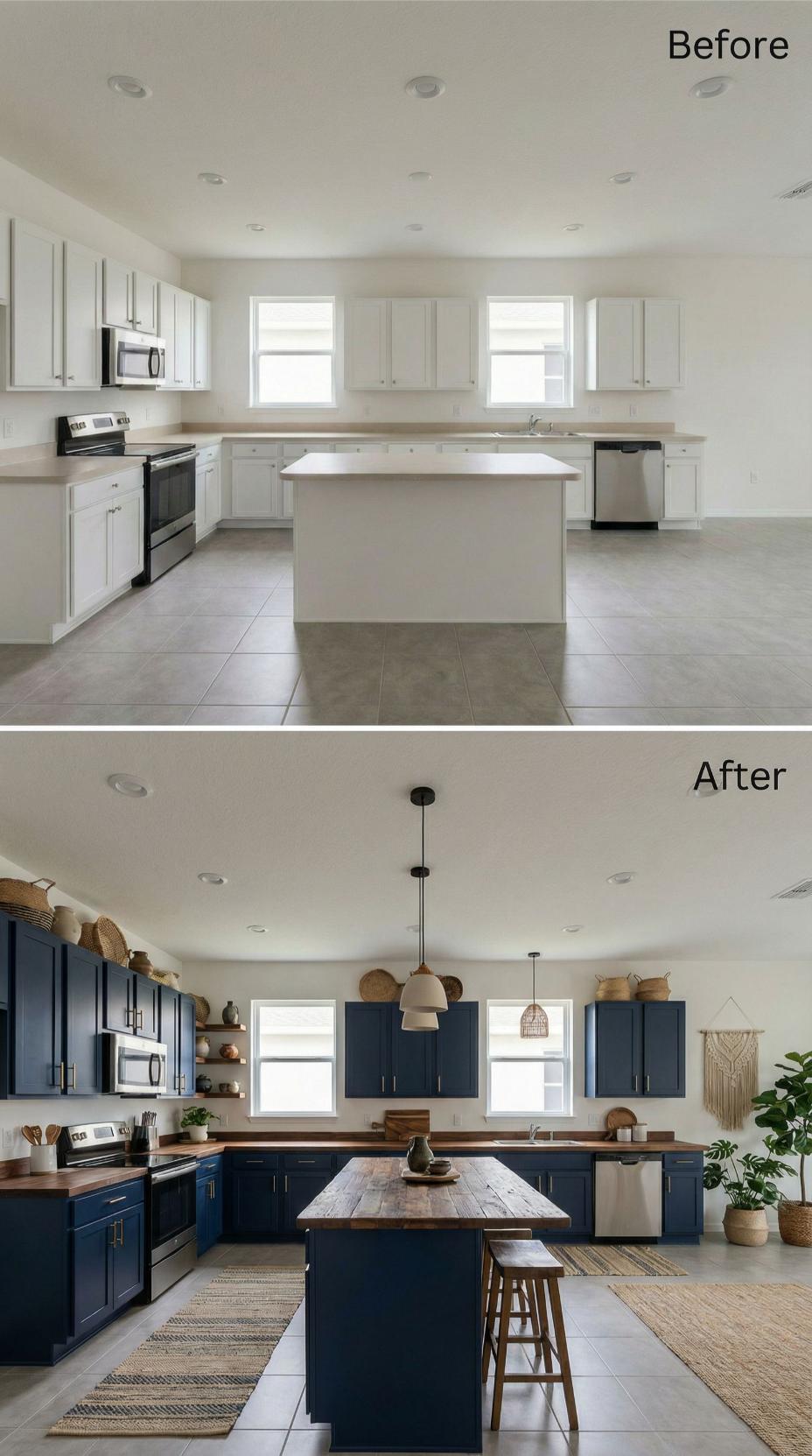 Deep navy blue painted cabinets completely reimagine this builder-grade kitchen, replacing stark white surfaces with rich color and personality. Warm wood countertops crown the island while woven pendant lights and open floating shelves introduce organic textures. Natural jute rugs, trailing greenery, and earthy ceramic bowls create a relaxed bohemian atmosphere that celebrates both function and style.