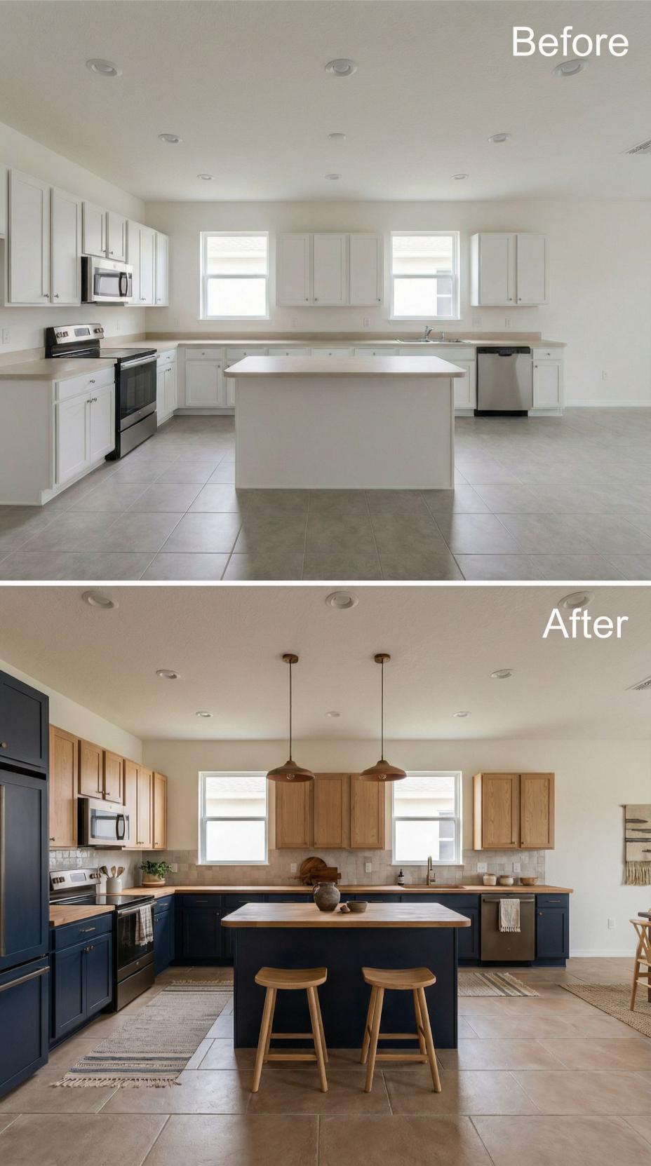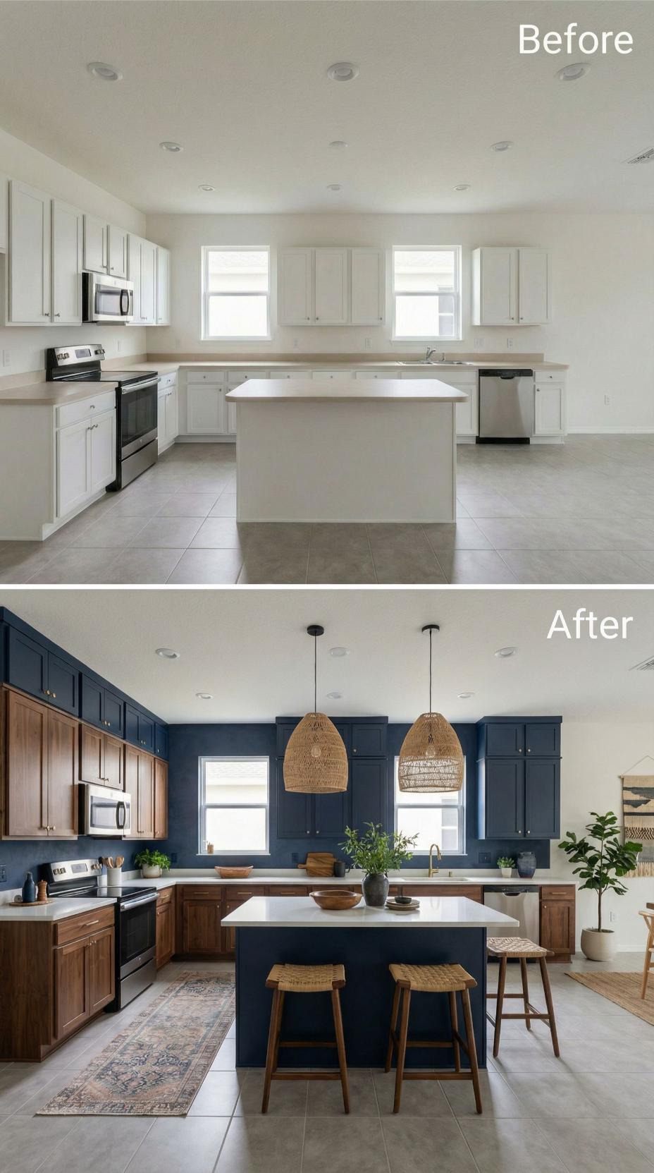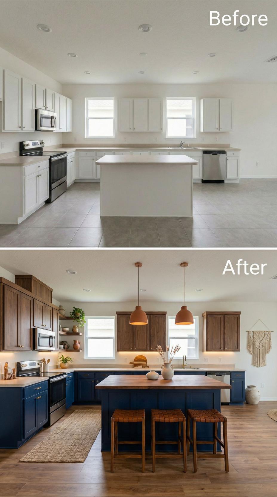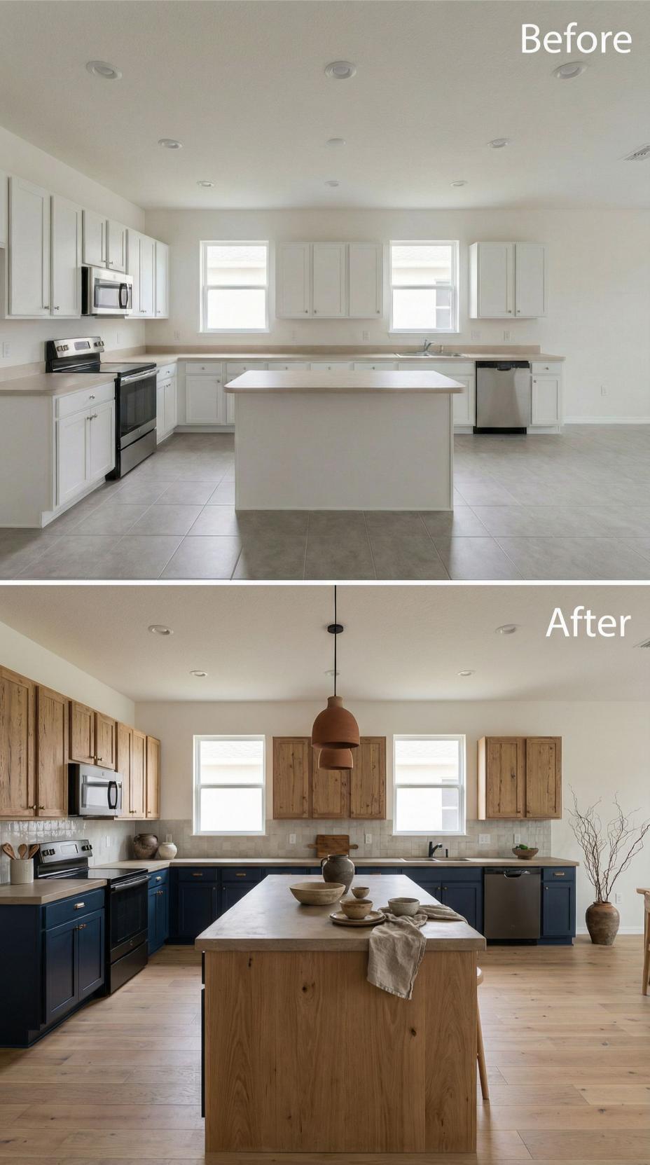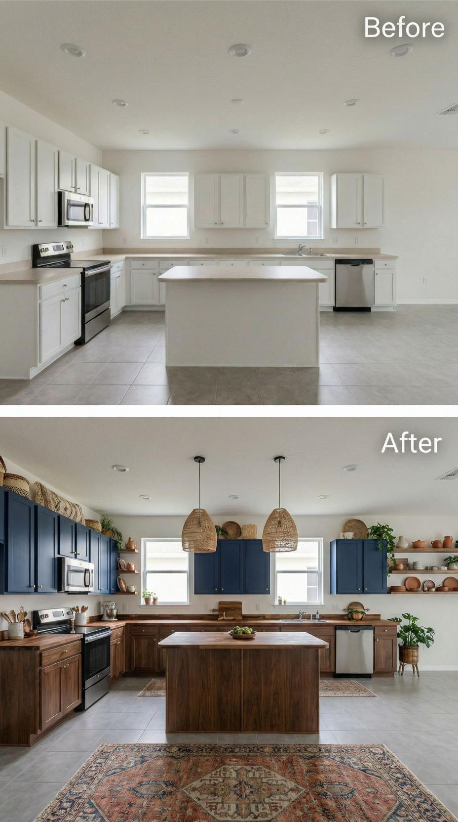 Natural walnut upper cabinets paired with navy blue lowers create stunning visual contrast in this complete kitchen makeover. Woven pendant lights and floating shelves replace stark recessed lighting, while natural wood flooring and rattan bar stools add organic warmth. Open shelving displays handcrafted pottery and wooden bowls, transforming sterile builder-grade basics into a sophisticated bohemian-inspired culinary haven.