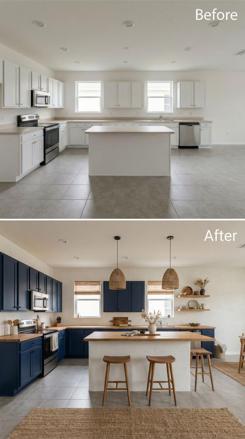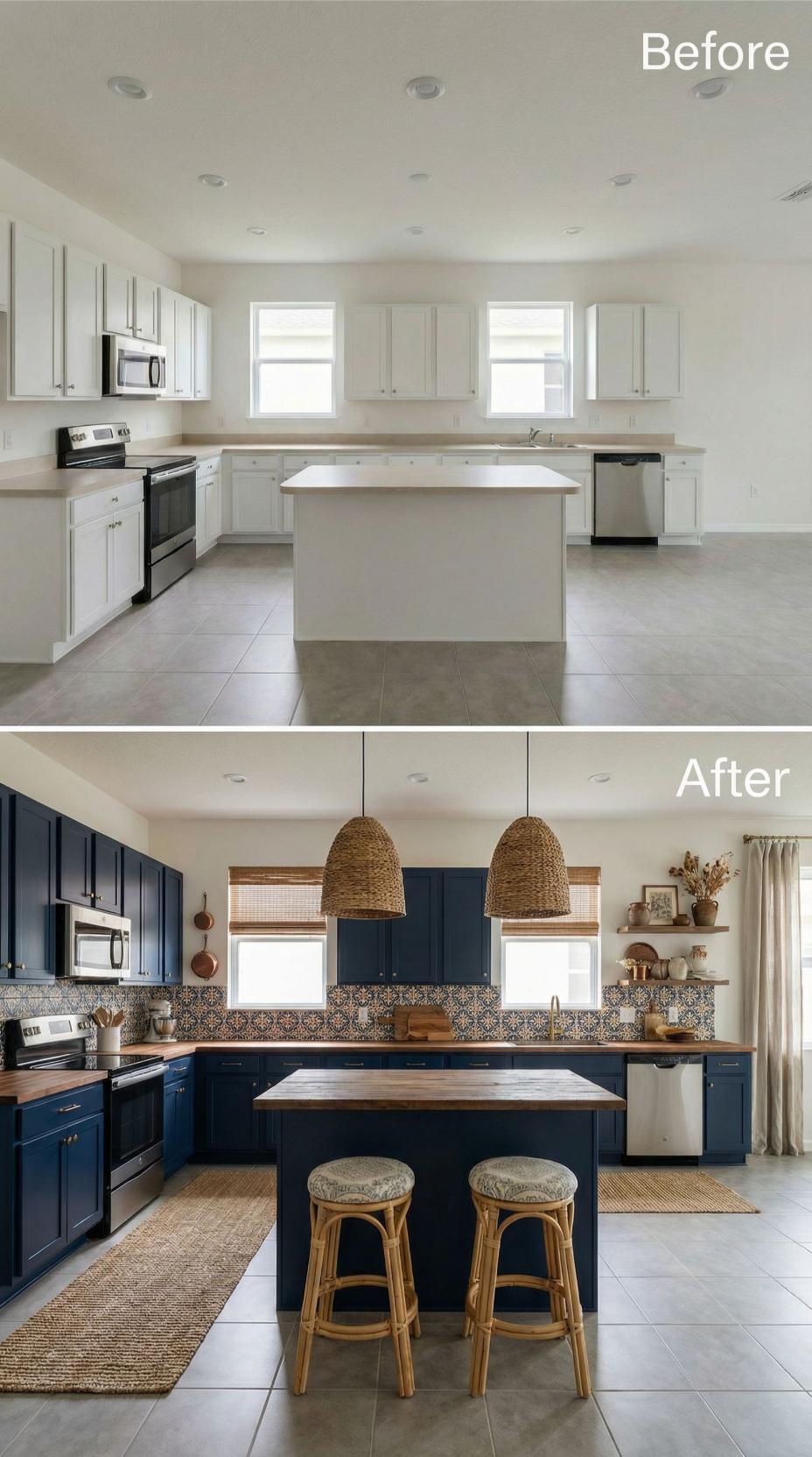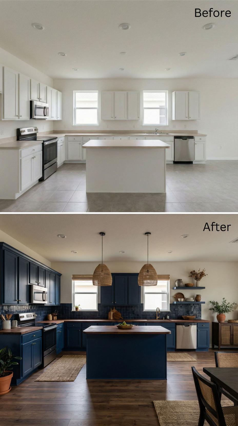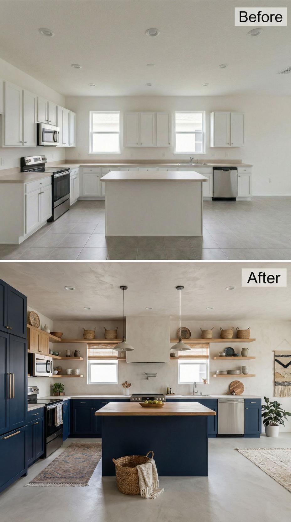 Bold navy cabinetry transforms a sterile builder-grade kitchen into a sophisticated Japandi-inspired space. Warm butcher block countertops and floating shelves soften the dramatic blue base, while natural wicker pendant lights add organic texture. Wooden bar stools around the white waterfall island create an inviting breakfast nook that perfectly balances minimalist function with boho warmth.