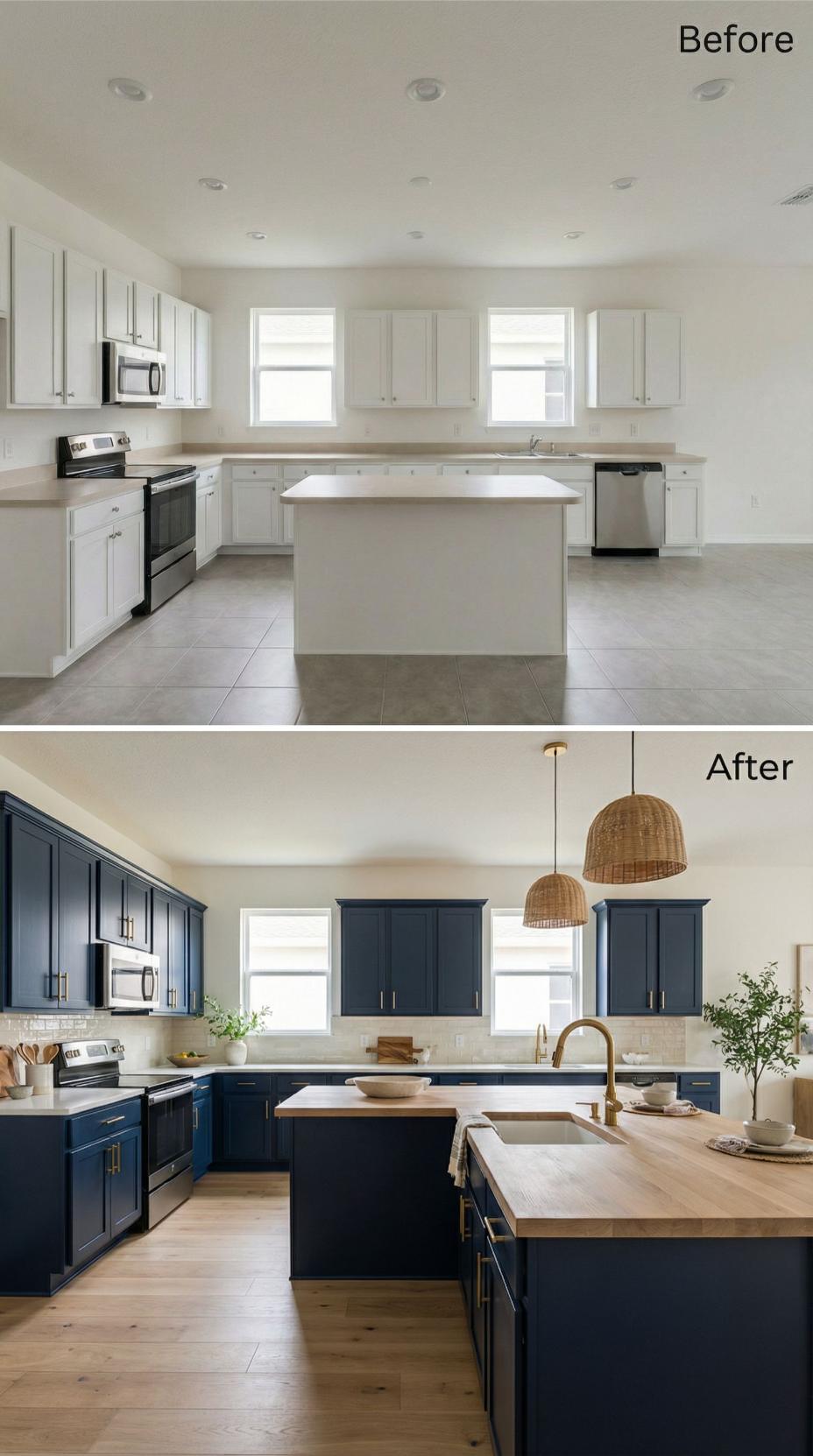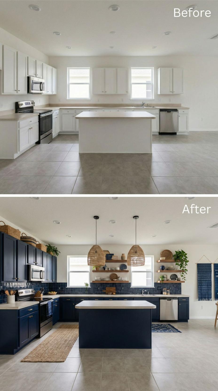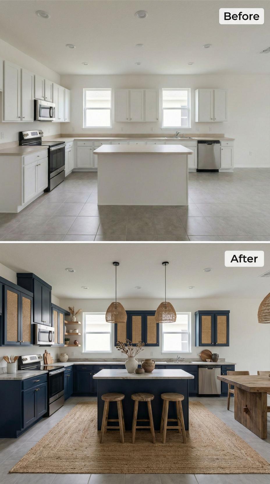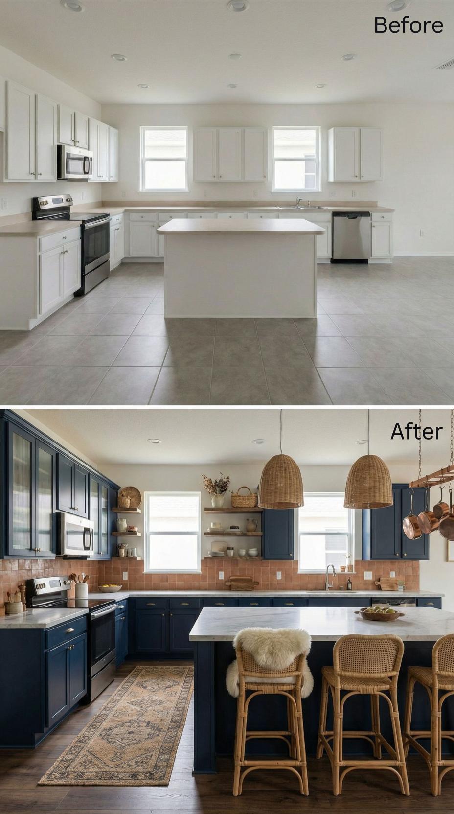 Deep navy cabinetry transforms this once-sterile builder-grade space into a warm, sophisticated kitchen that perfectly balances bohemian charm with Japanese minimalism. Natural wicker pendant lights and brass fixtures add organic texture, while butcher block countertops on the extended island create an inviting workspace. White subway tile backsplash keeps the aesthetic clean, allowing the rich navy cabinets to anchor this stunning transformation.