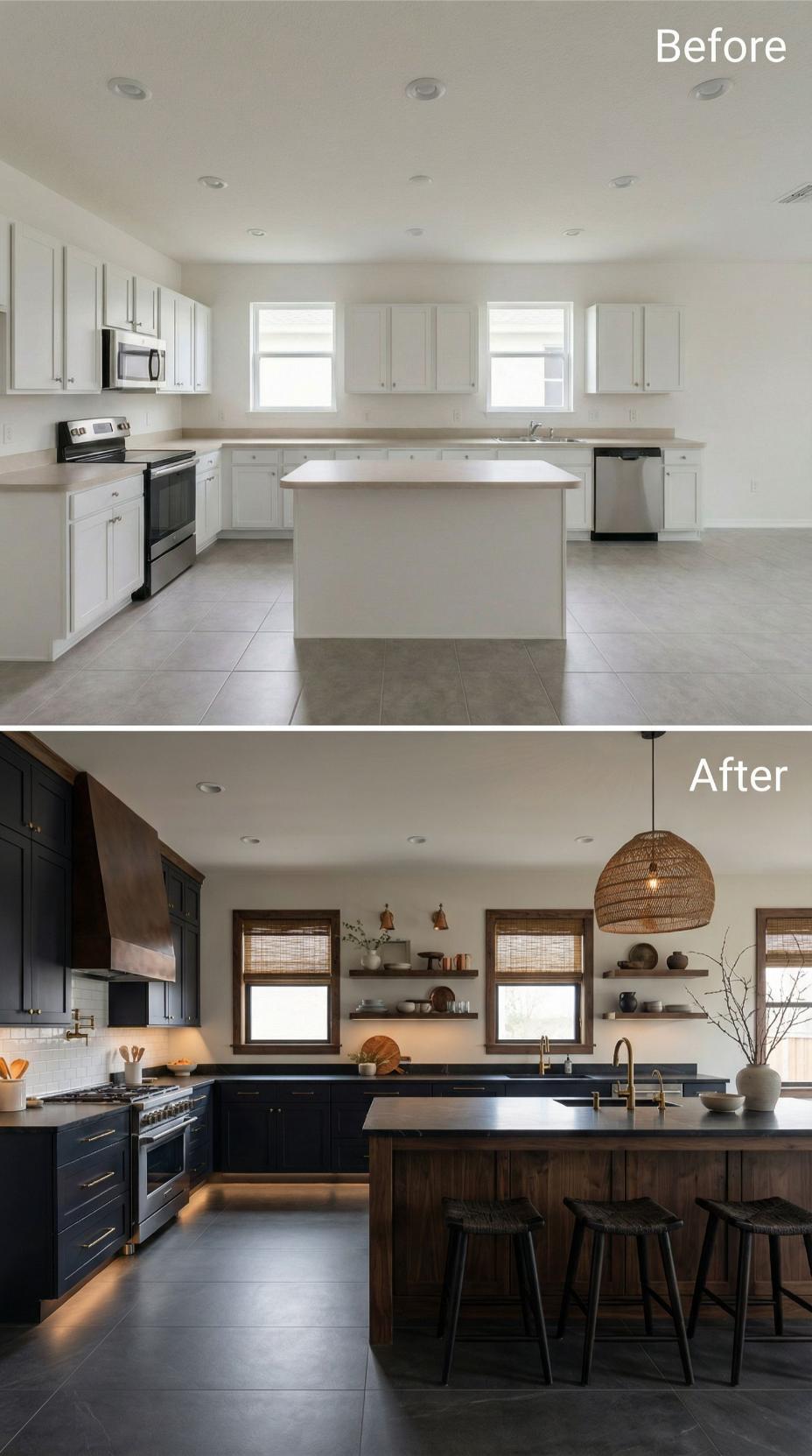Deep navy cabinets completely transformed this builder-grade kitchen into a bohemian sanctuary with rich character. Warm wood countertops and woven pendant lights replaced stark surfaces, while natural cane bar stools and vertical wood backsplash added organic texture. Plants and vintage rugs softened the space, creating an inviting gathering spot that balances moody sophistication with earthy warmth.