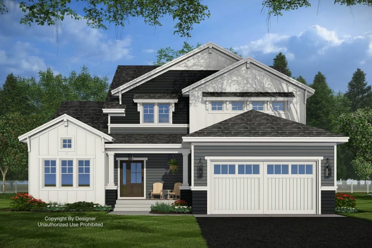 This home delivers modern craftsman curb appeal with bold siding contrast, clean trim lines, and an inviting covered front porch. The attached two-car garage keeps the exterior practical while maintaining a polished, cohesive look.