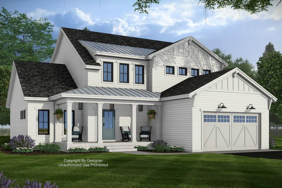 This New American farmhouse design blends classic charm with a clean, updated exterior featuring crisp siding, simple trim work, and a mix of rooflines that add depth without feeling busy. The covered front porch creates a welcoming entry, while the attached two-car garage keeps the layout practical for daily life.