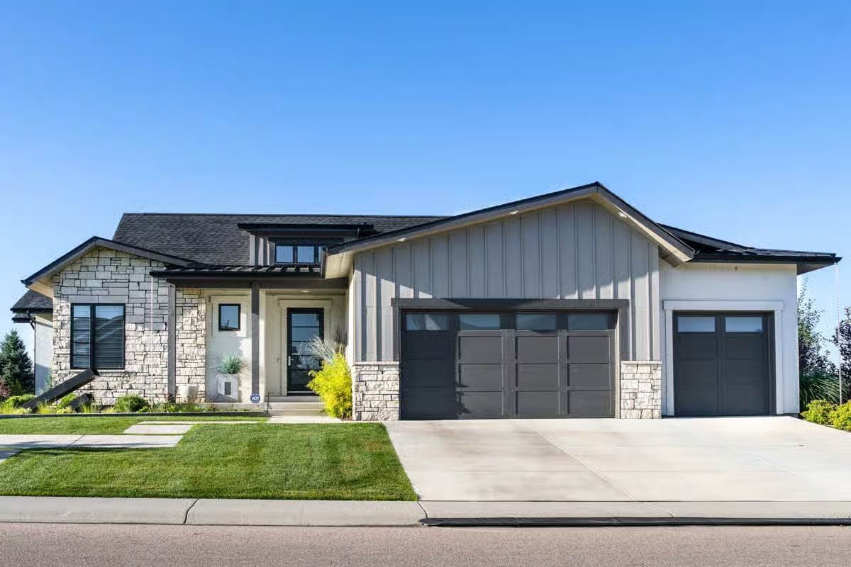 This New American ranch presents a clean, grounded exterior with a balanced mix of stone and vertical siding, low rooflines, and a straightforward entry that feels modern without being overdesigned. The attached multi-bay garage is integrated into the faรงade, giving the home a strong horizontal presence while keeping the overall look practical and cohesive.