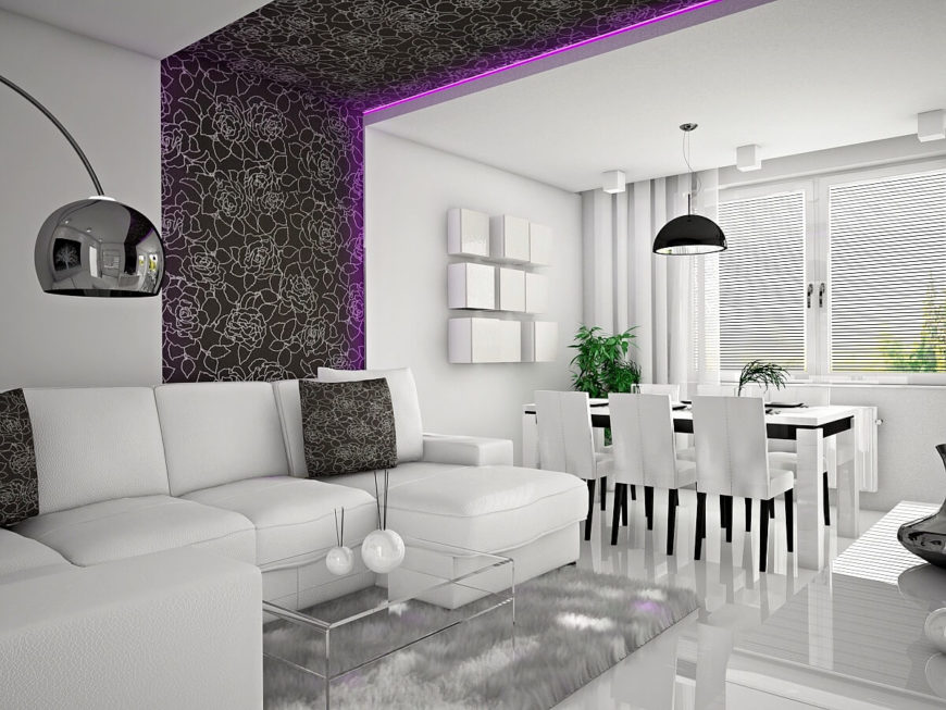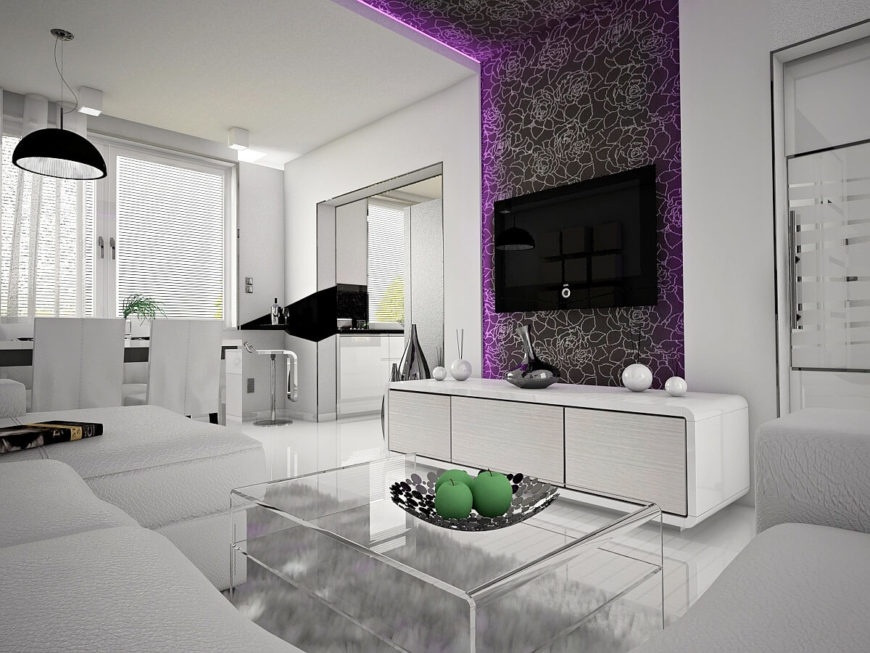 Taking a few steps back, we end up in the family room. A strip of floral wallpaper visually separates each distinct space, and a light purple LED strip adds further modernity. Matching throw pillows tie the living room to the wallpapered strip.