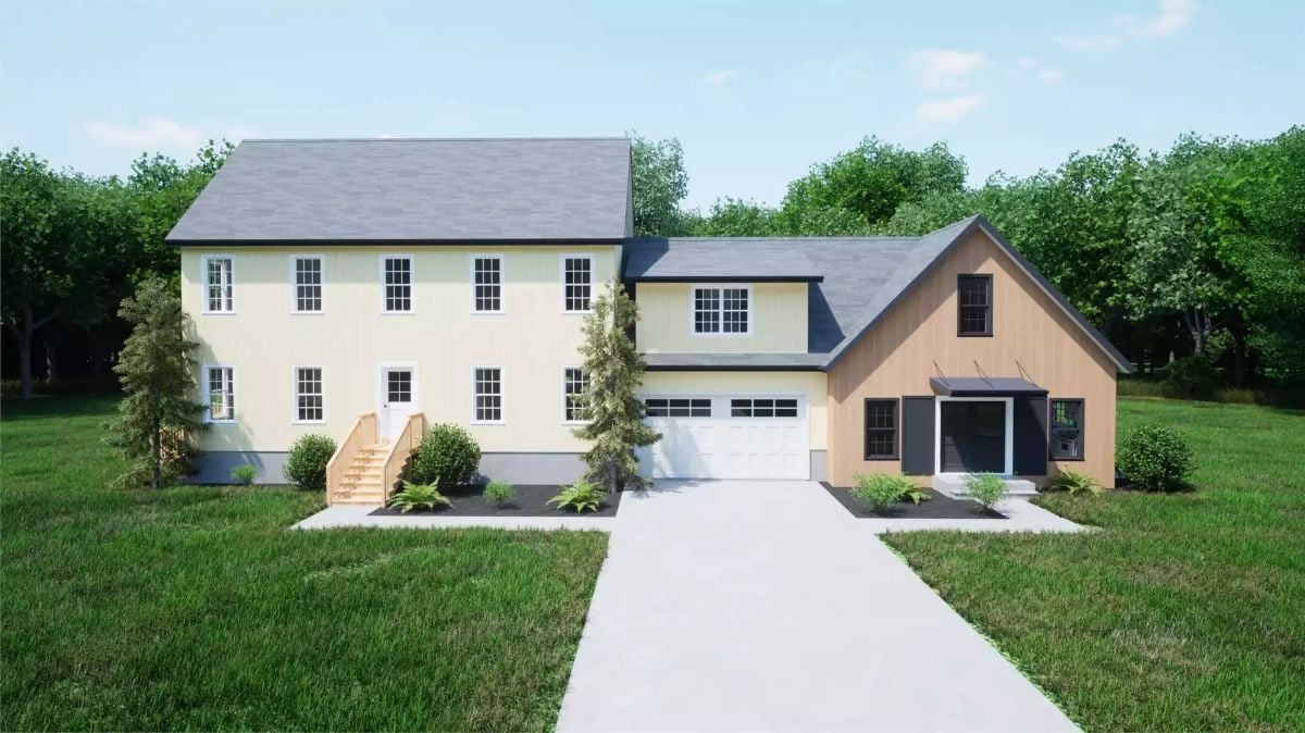 This modern farmhouse exterior features clean siding, classic rooflines, and a barn-style garage wing that adds contrast and visual interest. Large windows and a simple covered entry keep the design practical while still feeling updated.