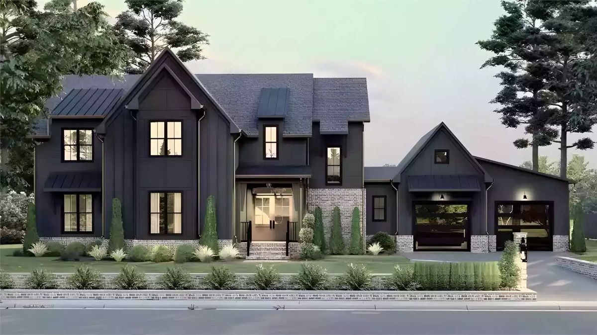 An exterior rendering of a modern farmhouse sits above two floor plan layouts, including the main first floor and an alternate fireplace placement option.