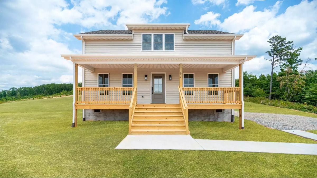 This country-style home features a balanced two-story exterior with clean siding, a broad covered front porch, and a symmetrical faรงade that feels welcoming and practical. The elevated design and simple rooflines give it a classic presence that works well in a range of settings.