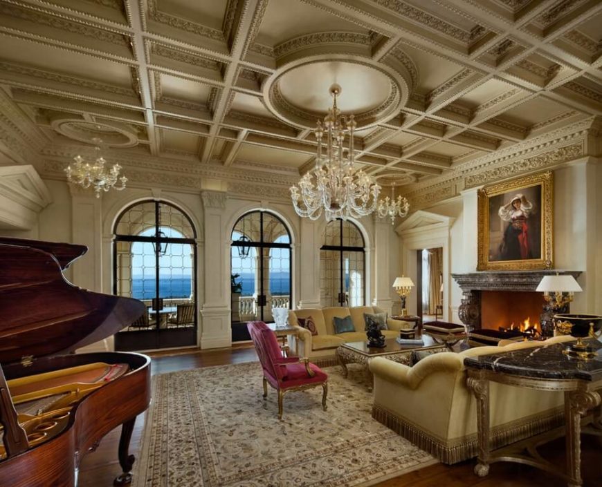 Youโll want to collapse onto one of those comfy slip-covered sofas, which create a lovely seating area around the fireplace in this traditional style home. The beautiful white coffered ceilings make the room seem spacious. Take a look at that stunning view out to the boat deck from the glass accordion doors. There really is no shortage of lighting with the wall sconces, floor lamp, and table lamps on the console behind the sofa.