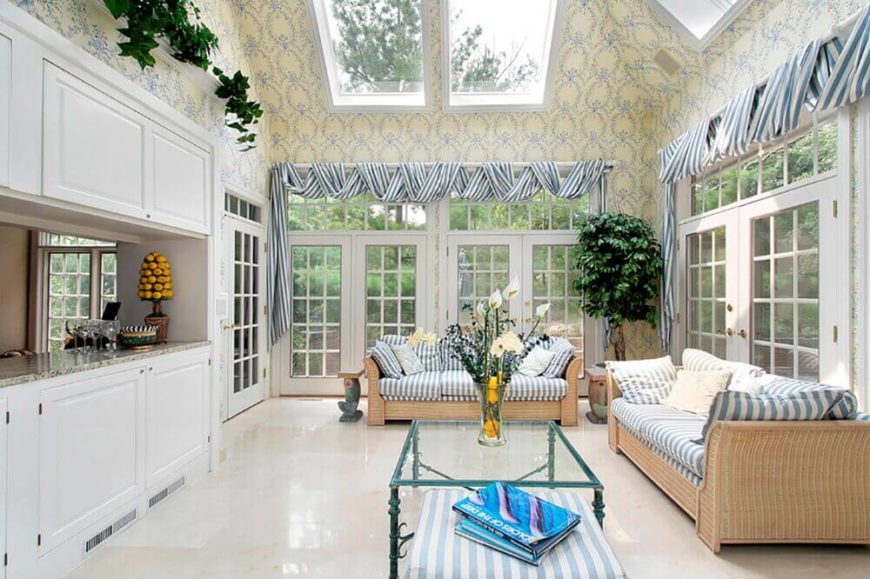 The baby blue painted walls create a cozy space for this country-inspired formal living room. From the rustic wood door and matching wood floors to the patterned drapes, you feel like youโve stepped into a charming cottage. However, traditional elements include the curved arm sofa, upholstered ottoman, and decorative wall mirror. The only thing that strikes me as odd is the modern globe lamp on the side table; itโs too modern for this space and seems out of place.
