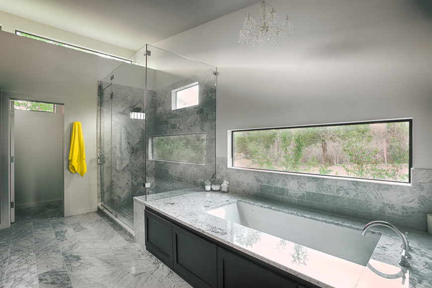 The bathroom contrasts the bright whites of the rest of the home with deep marble tones, throughout the flooring and bath areas. Large glass-enclosed shower stands next to the soaking tub, with natural light cascading in above.