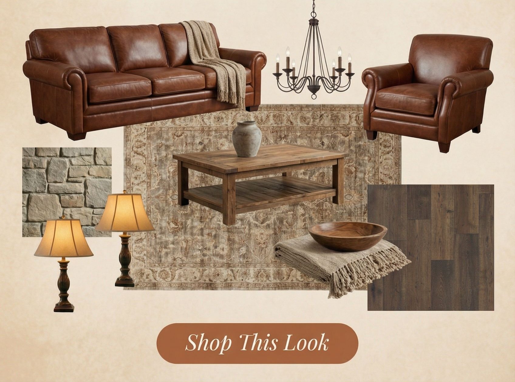 Leather and Wood Panel Living Room with Tobacco-Stained Beams