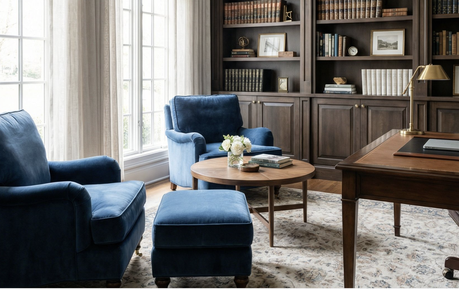 Quiet Luxury Home Office Featuring Rare Book Showcase