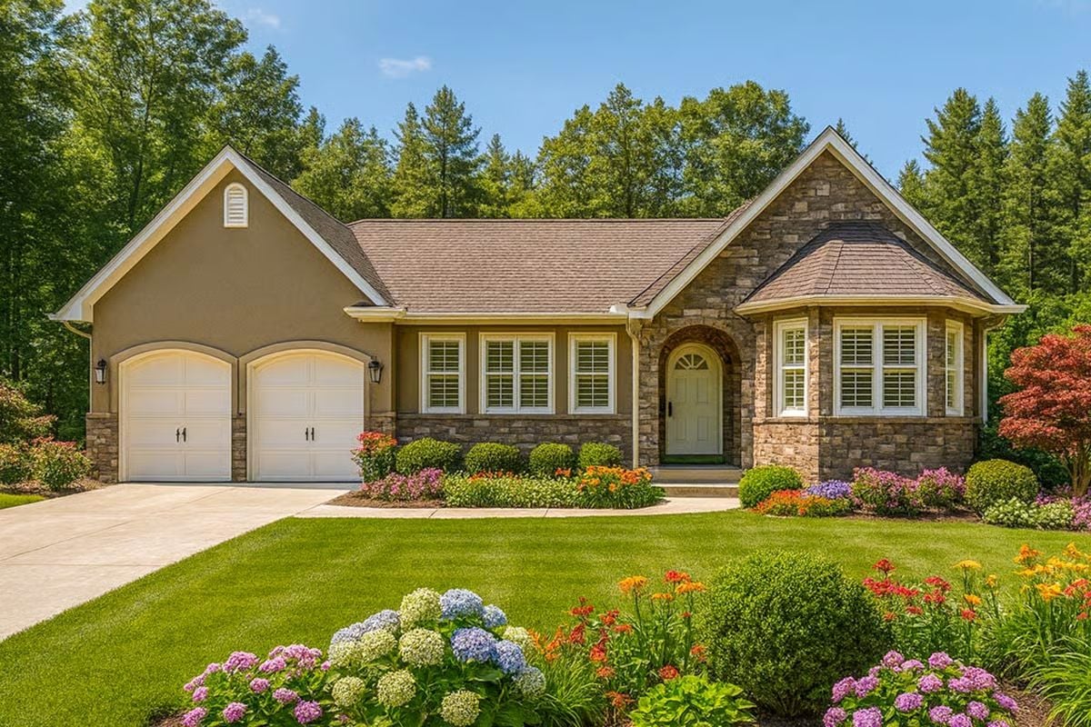This ranch home features smooth stucco siding with natural stone accents and an inviting arched entry. The two-car garage and varied rooflines create visual interest while maintaining the classic single-story appeal.