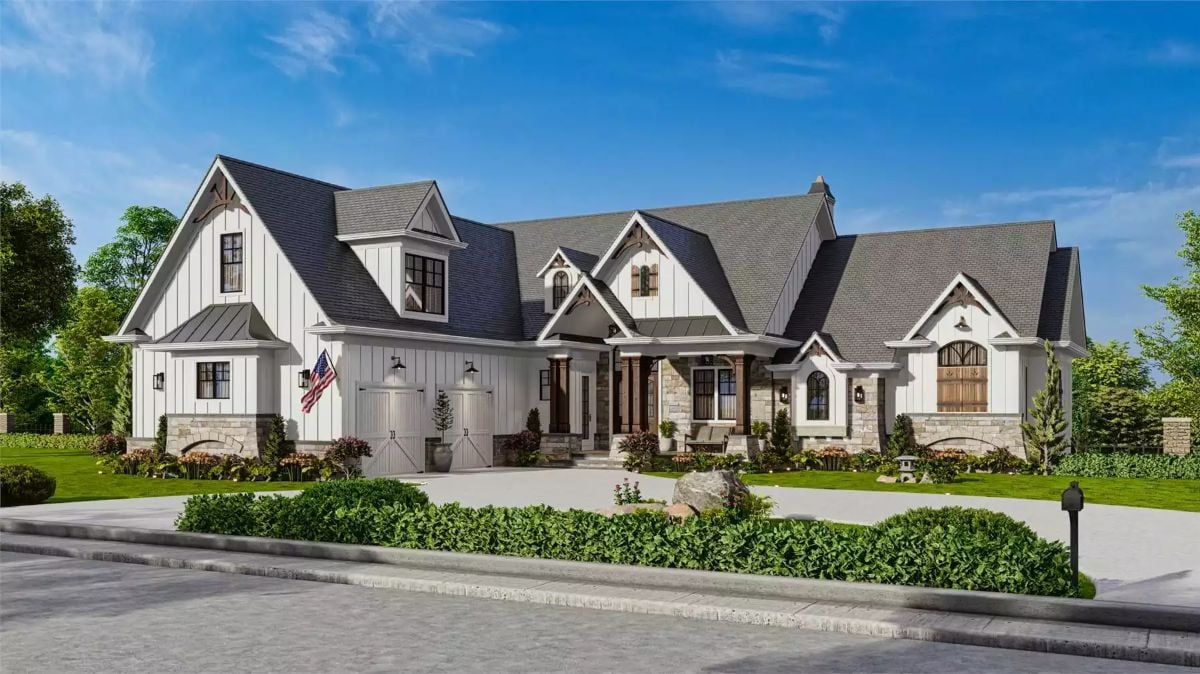 Editor’s Note: White board-and-batten siding paired with black window frames is one of the most requested exterior combinations in modern farmhouse construction. The wood truss detail beneath the gabled dormer adds warmth that painted surfaces alone cannot provide. Landscaping with Italian cypress trees reinforces the vertical lines of the facade.