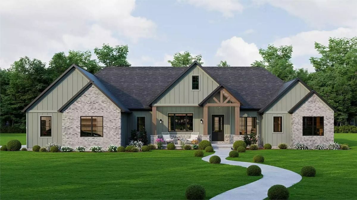 Worth Knowing: A butler’s pantry positioned between the kitchen and dining area keeps serving ware and small appliances out of sight during meals. That separation reduces visual clutter without requiring a dedicated prep kitchen, making it a practical choice for single-story builds where square footage is already stretched across a wide footprint.