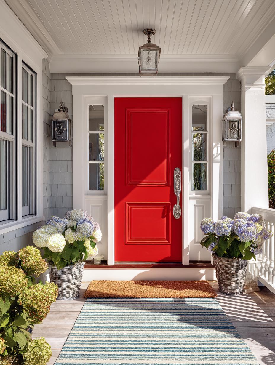 Bold red paint transforms a traditional two-panel door into a stunning focal point that commands attention from the street. White sidelights with divided glass panes flank the entrance, while matching lantern sconces provide symmetrical illumination. Wicker baskets filled with blue and white hydrangeas soften the architectural lines, creating a welcoming approach that balances classic formality with cottage charm.