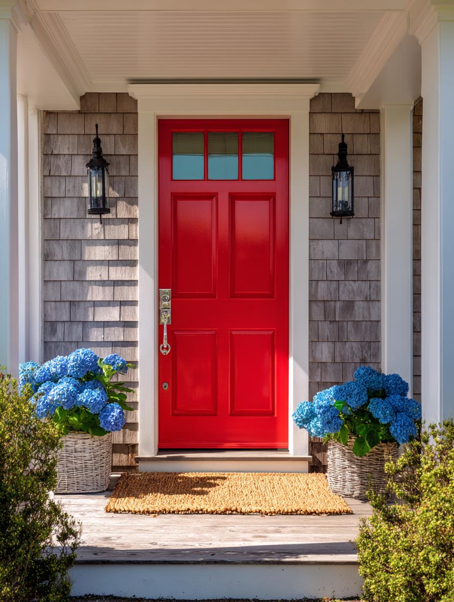 Bold red paint transforms this traditional six-panel door into a stunning focal point against weathered cedar shingle siding. Black lantern-style sconces provide symmetrical lighting while blue hydrangeas in wicker baskets create seasonal color coordination. White trim and columns frame the entrance beautifully, while a natural fiber doormat adds welcoming texture to complete this timeless coastal-inspired design.