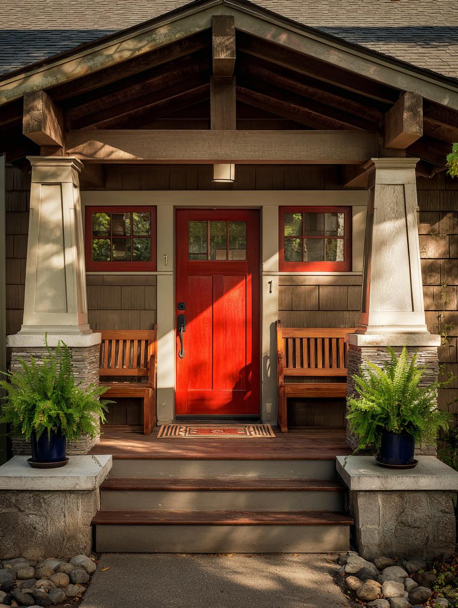 Bold crimson paint transforms this traditional craftsman entrance into a welcoming focal point that perfectly balances rustic charm with refined elegance. Natural cedar shingles and exposed timber beams frame the striking red door, while tapered columns rest on stacked stone bases for authentic architectural appeal. Matching wooden benches and lush ferns in navy planters complete this inviting porch design that celebrates classic American craftsmanship.
