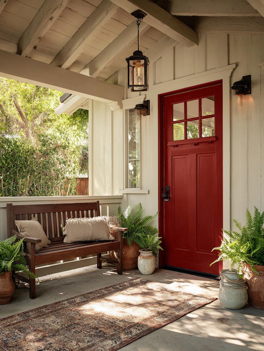 Bold red paint transforms this traditional craftsman door into a stunning focal point that welcomes guests with warmth and character. The rich crimson finish contrasts beautifully against crisp white trim and exposed ceiling beams, while a dark wood bench provides functional seating beside potted ferns. Black lantern lighting and vintage-style planters complete this inviting entryway that balances classic architecture with vibrant color choices.