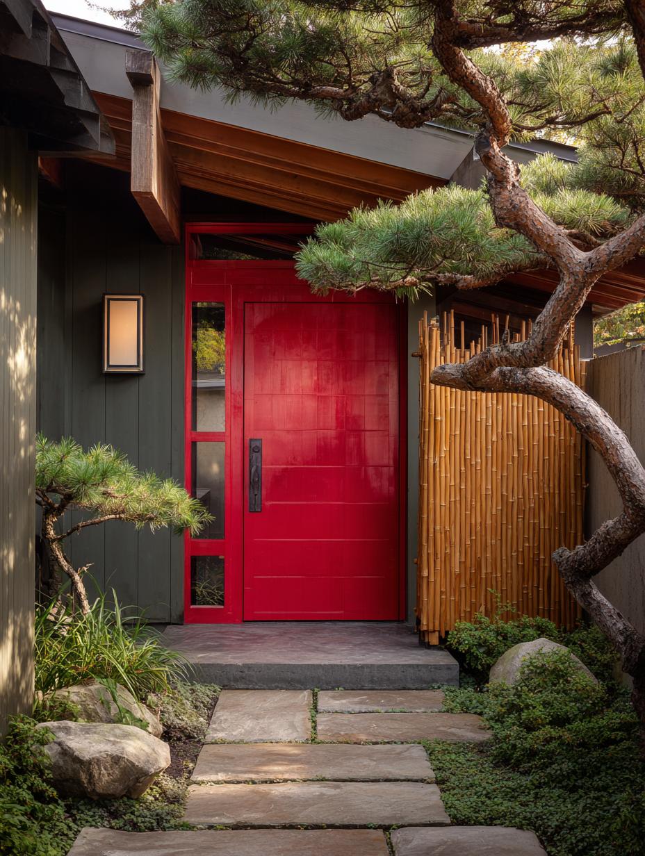 Bold crimson paneled doors create dramatic contrast against charcoal vertical siding in this zen-inspired entrance. Natural pine overhangs frame the entry while twisted sculptural branches weave through the composition. Stone pavers lead visitors through carefully curated plantings toward the striking bamboo privacy screen. Warm lighting and organic textures balance the doorโs vibrant punch with serene Japanese garden elements.