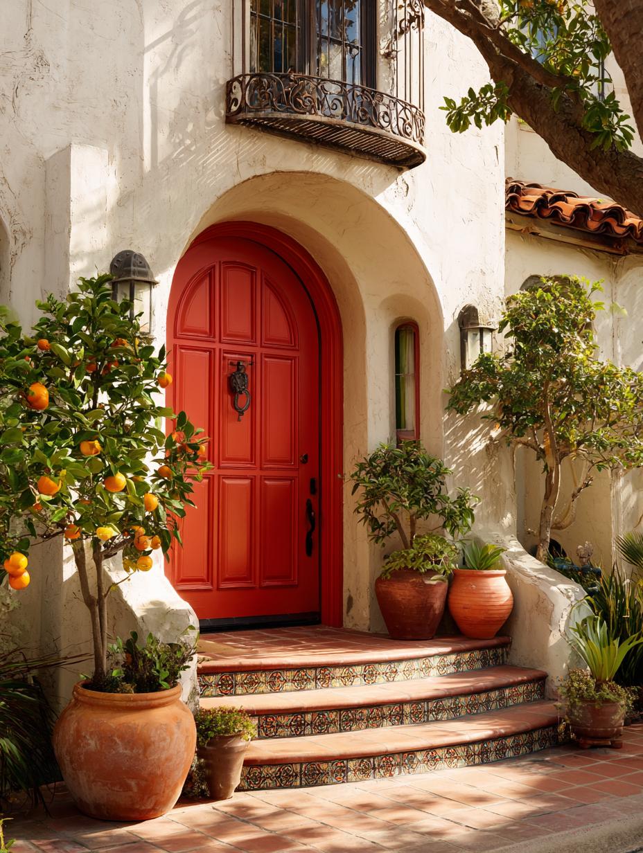 Rich coral-red paneled doors create stunning curb appeal against weathered stucco walls in this Spanish Colonial revival entrance. Decorative ceramic tiles border each step, while terracotta planters filled with citrus trees frame the arched doorway. Wrought iron balcony railings and lantern-style sconces complete the Mediterranean aesthetic. Natural shadows from mature trees enhance the warm, inviting atmosphere that welcomes guests with old-world charm.