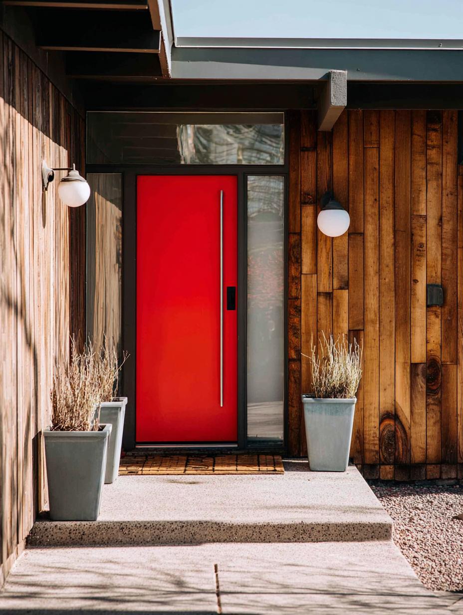 Modern Red Door Entry with Natural Wood Slatted Screen Details