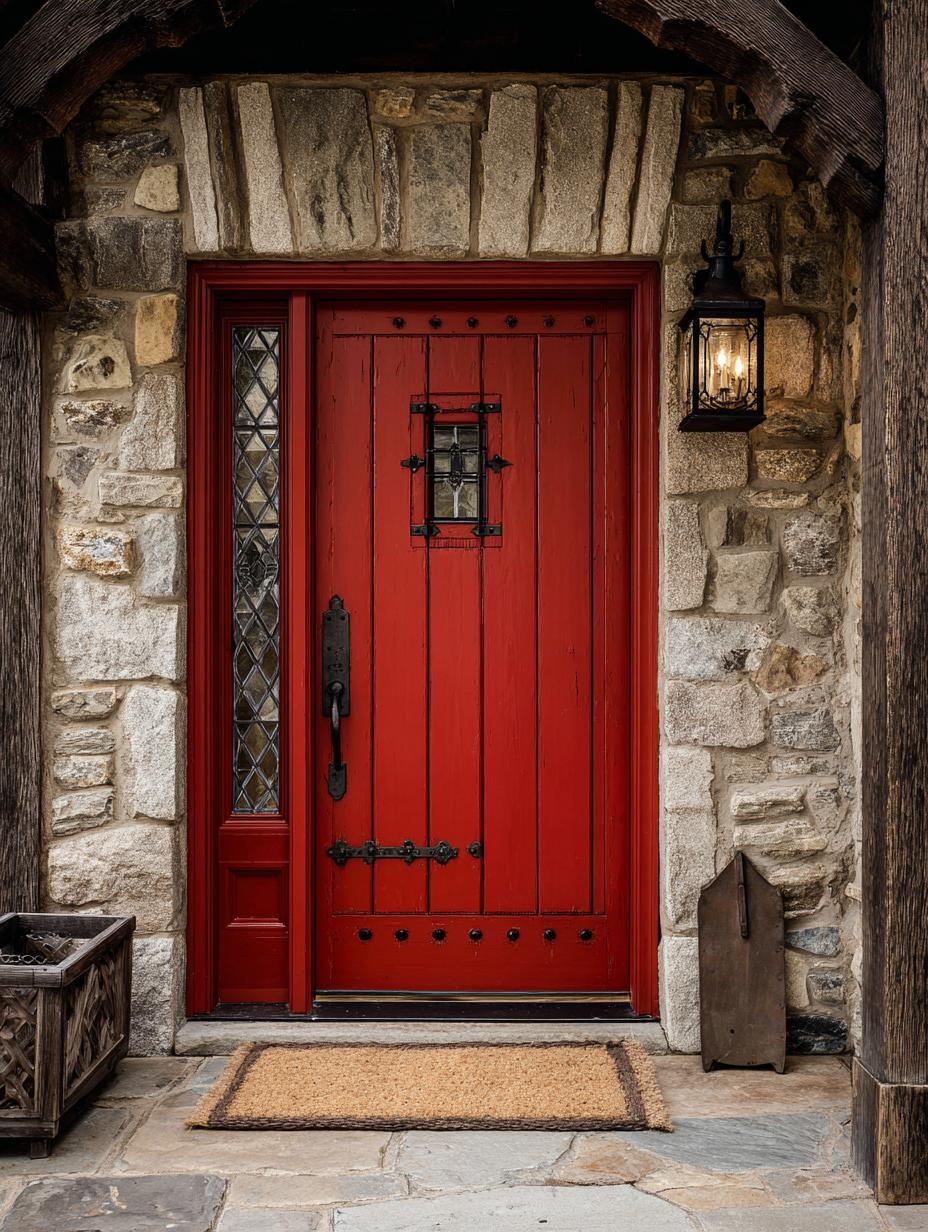 Medieval-Inspired Red Door with Rustic Stone and Timber Framing