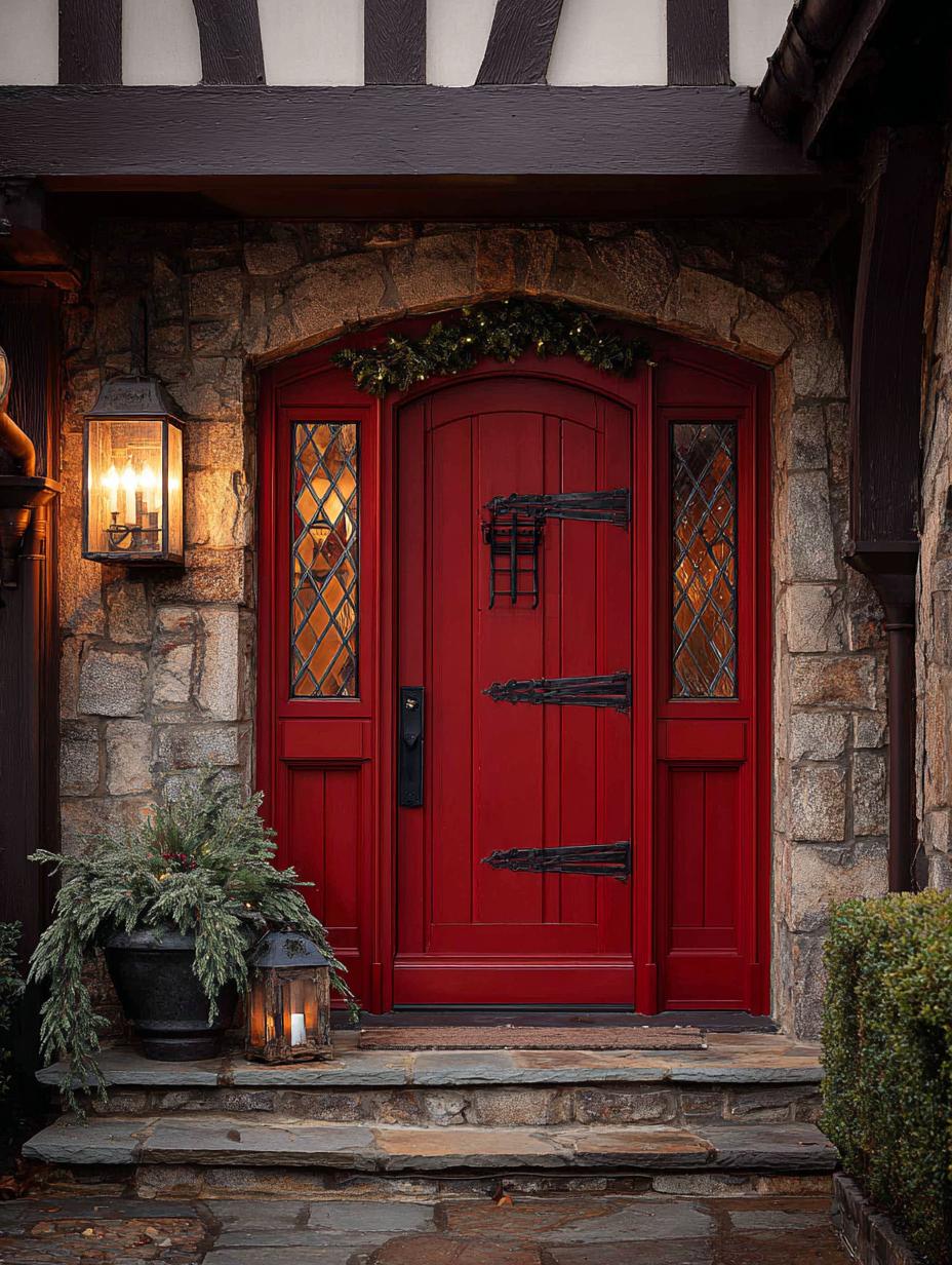 Rich burgundy red paint creates stunning contrast against weathered stone masonry and dark timber framing in this Tudor-inspired entryway. Decorative wrought iron hinges add authentic medieval character to the solid wood door, while diamond-patterned leaded glass sidelights filter warm light beautifully. Evergreen garland crowns the arched doorway, enhancing the homeโs Old World charm and creating an inviting holiday welcome.