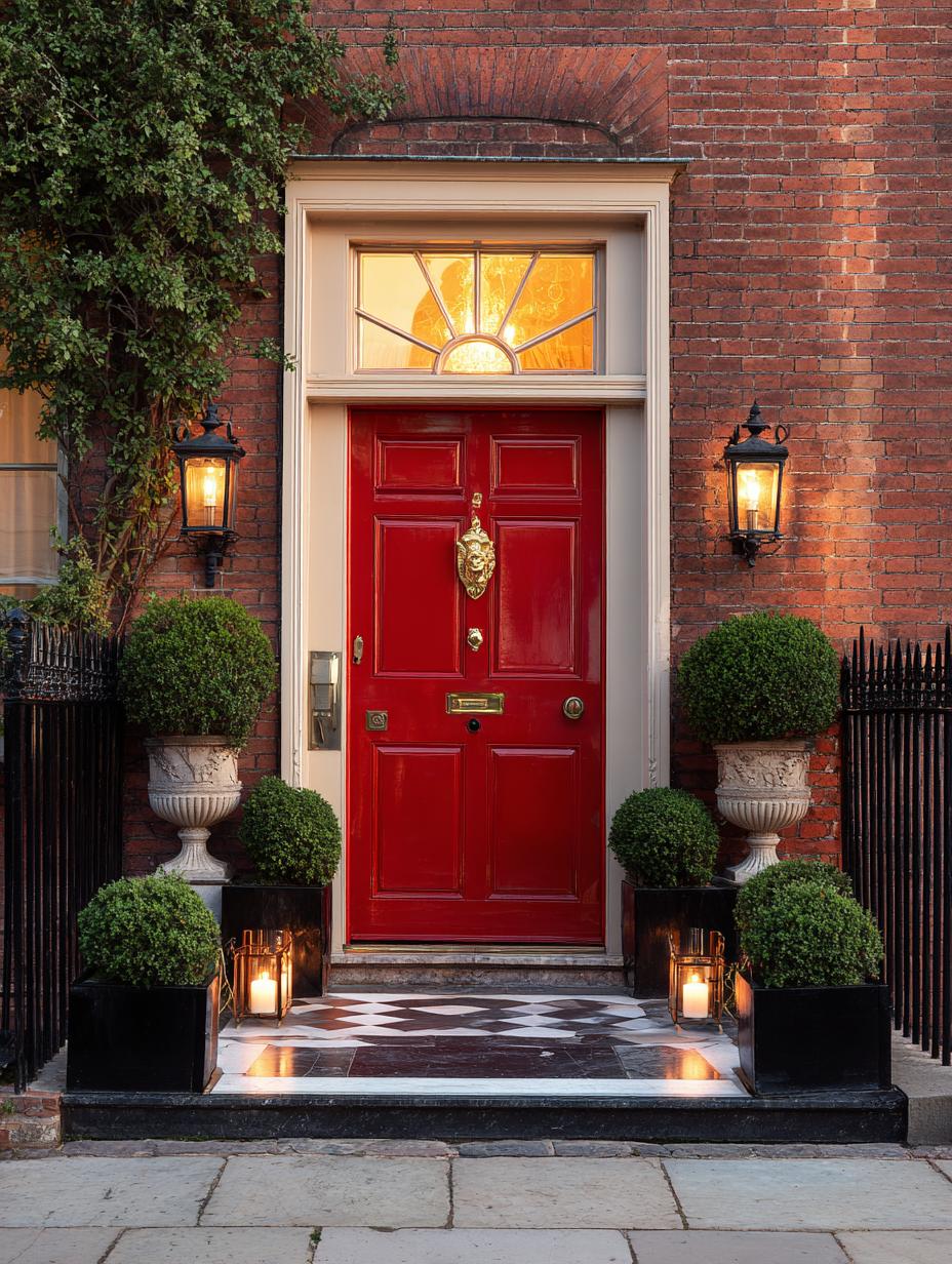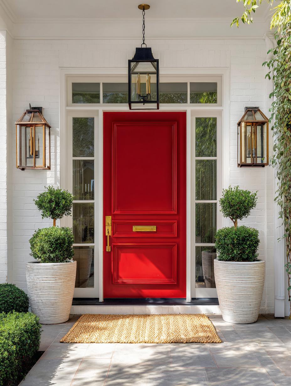 Bold red paint transforms a traditional paneled door into a stunning focal point that commands attention from the street. Brass hardware adds warm metallic contrast while flanking copper lanterns create perfect symmetry. Manicured boxwood topiaries in textured planters frame the entrance, and sidelights maximize natural light flow into the homeโs interior.